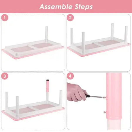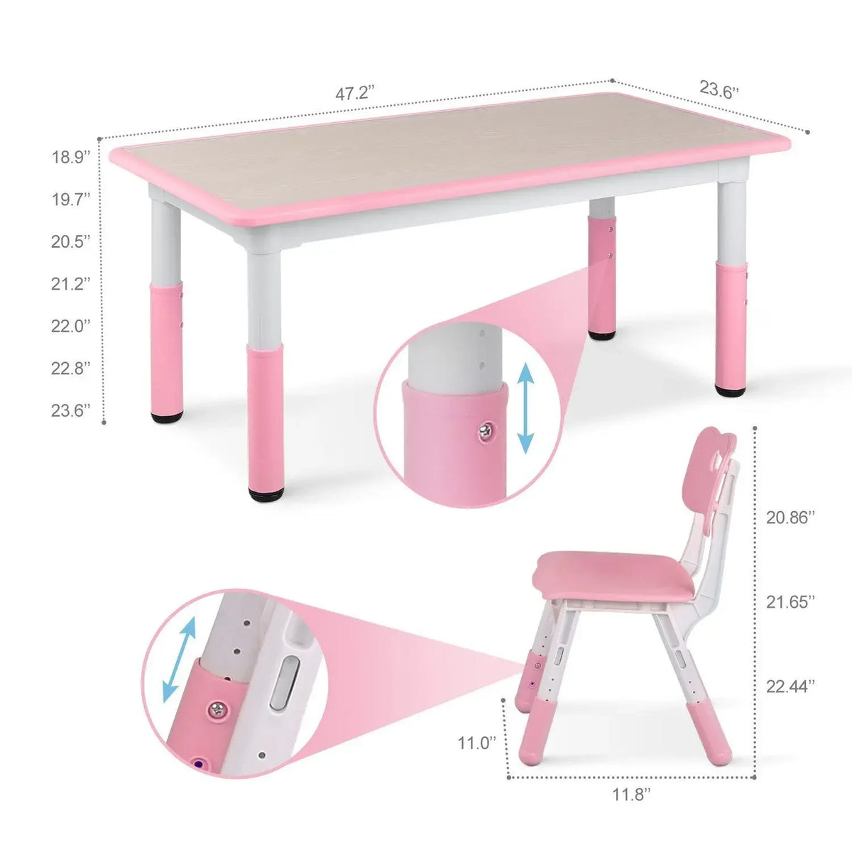 I colori disponibili includono Blu, Verde, Rosa e Verde Menta, facilitando l'abbinamento al tema di una stanza o allo schema cromatico di una classe. Il processo di montaggio è semplice con assemblaggio richiesto (circa 20 minuti), e il design con rinforzo a trave garantisce che i mobili rimangano robusti nell'uso quotidiano. Il tavolo e le sedie sono adatti per aule, angoli studio, camerette, cucine e altro.