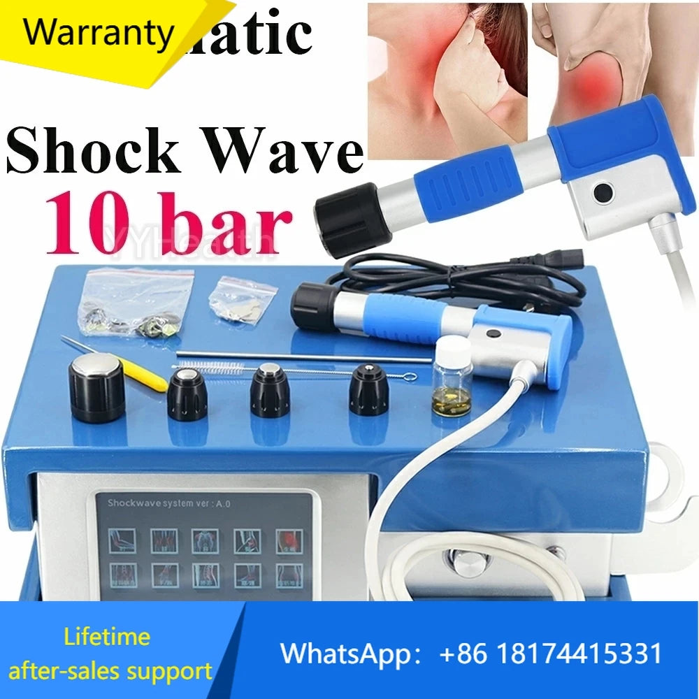 Pristatome 10 Bar Pneumatinį Šoko Bangų Terapijos Aparatą Skausmo Malšinimui, specializuotą fizioterapijos prietaisą, sukurtą teikti tikslią, neinvazinę šoko bangų terapiją skausmo malšinimui. Įrenginys naudoja pneumatinį slėgį, kad generuotų šoko bangas, kurios stimuliuoja audinių gijimą, gerina kraujotaką ir padeda sumažinti lėtinį skausmą paveiktose srityse.