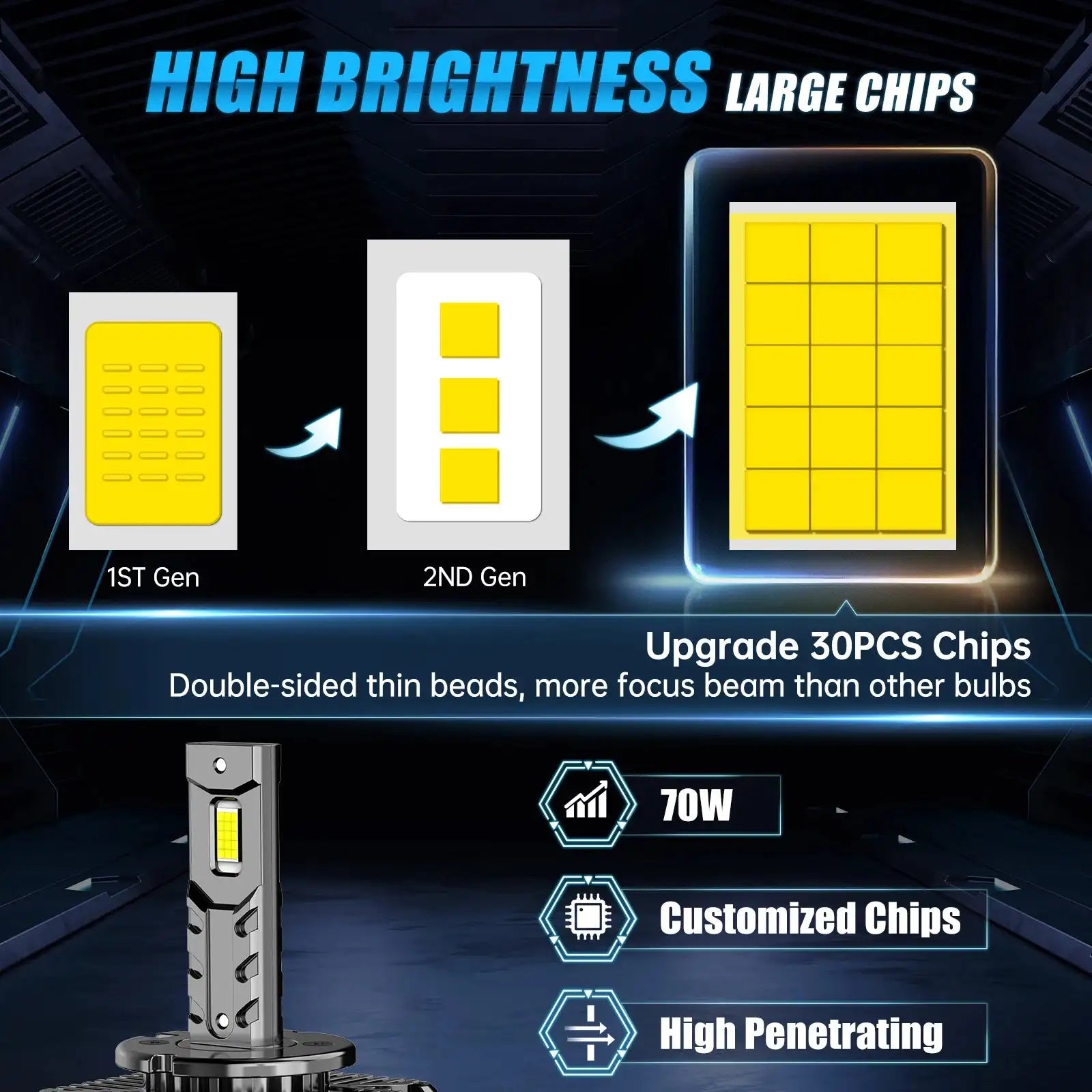 Patobulinkite savo naktinį vairavimą su BEVINSEE D1S D1R LED žibintų lemputių rinkiniu. Šis 35W, 7000 lm sistema suteikia ryškią 6000K baltą šviesą, kad geriau matytumėte tamsiuose keliuose. Sukurtas universaliems automobiliams, jis tarnauja kaip universalus LED pakeitimas HID xenon sistemoms ir tinka keliems formatams, įskaitant D1S, D3S, D3R, D5S, D2S ir D2R. Aviacinio aliuminio 6063 korpusas užtikrina efektyvų šilumos išsklaidymą, padedantis lemputėms pasiekti ilgą tarnavimo laiką, viršijantį 50,000 valandų. Su CANBUS suderinamumu ir CE/EMARK sertifikatu, šios lemputės sukurtos patikimumui ir saugiam veikimui plačiame automobilių asortimente.