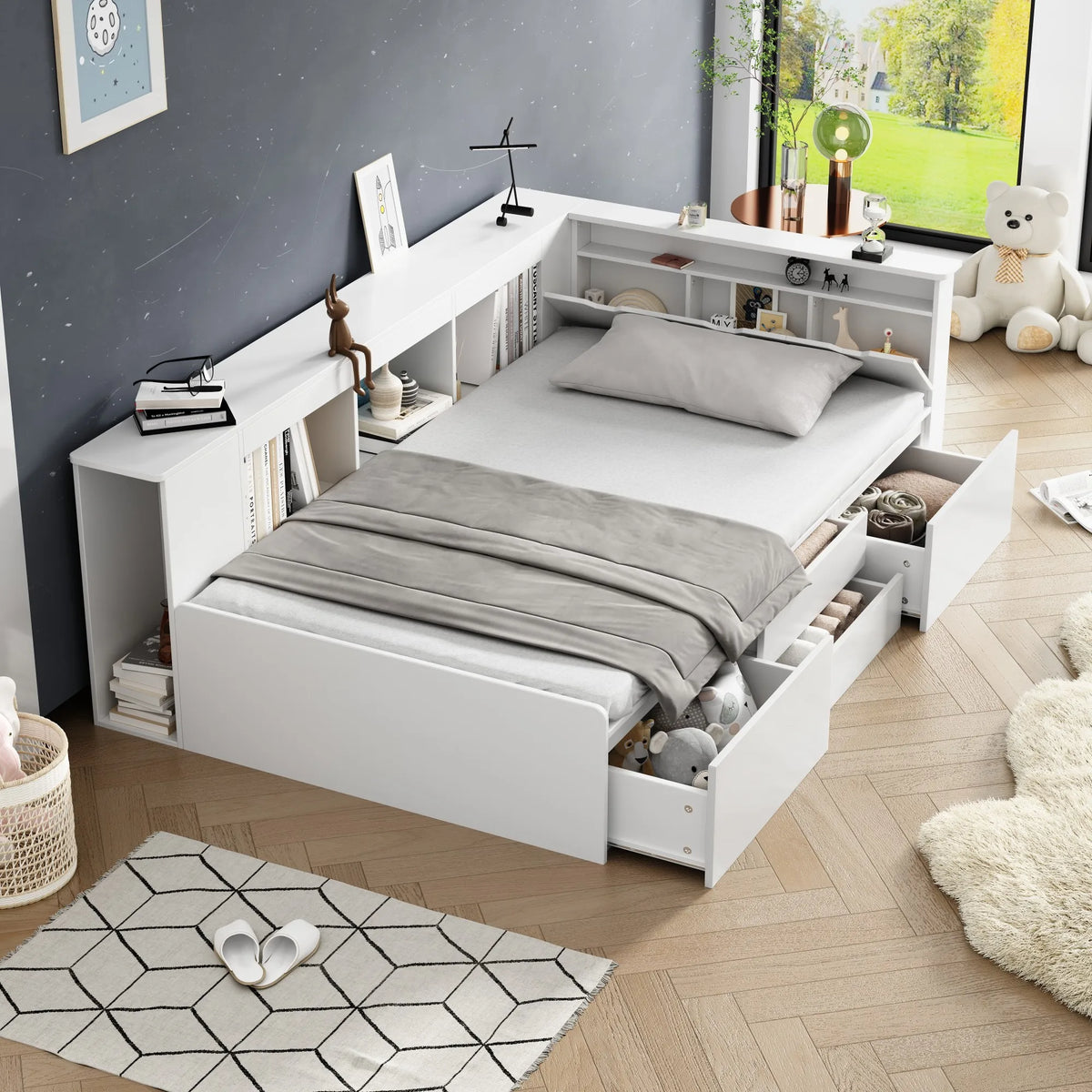 Baltas 90x200 Cm Vaikų Lovos Su Stalčiais Ir Lentynomis Saugojimui