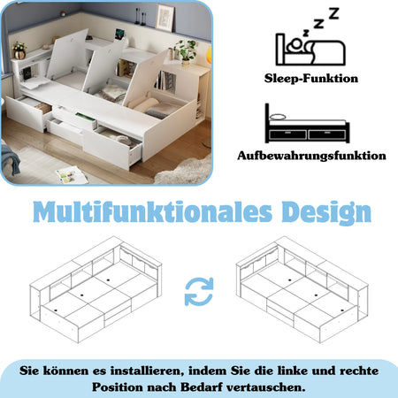 - Balta 90x200 cm vaikų lovos konstrukcija su integruotais stalčiais ir lentynų saugojimu
