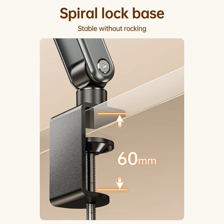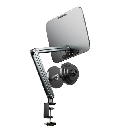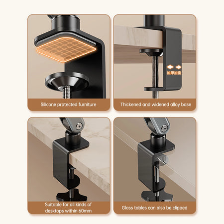 Laikiklio aukštį ir kampą galima laisvai reguliuoti, kad atitiktų jūsų sėdimą ar stovimą padėtį. Patikimas spiralinis užraktas tvirtai laiko stalus iki 60 mm storio, o silikono pagalvėlė apsaugo jūsų paviršių nuo įbrėžimų. Pagamintas iš aliuminio-plastiko panelės, aliuminio lydinio rankos ir anglinio plieno spaustuko, jis sukurtas ilgaamžiškumui ir patikimam naudojimui daugelį metų.
