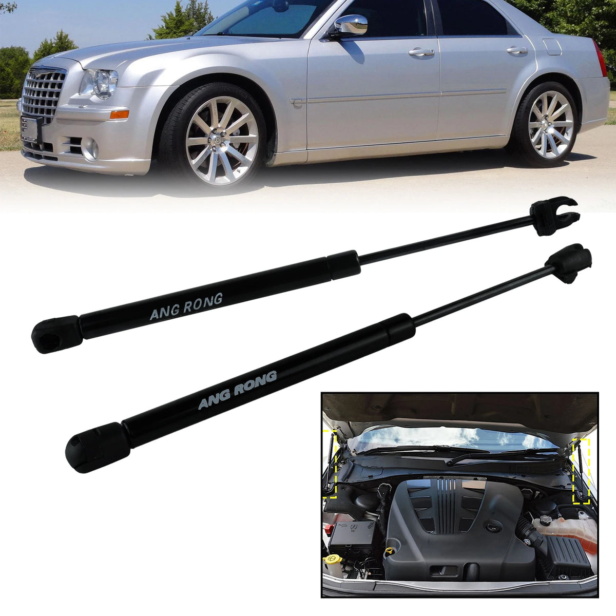 Rinkinys yra specialiai pritaikytas Chrysler 300C Touring Estate 2004-2010 ir Chrysler 300CLX/Sedan 2004-2012, siūlantis tikslų pritaikymą priekinėje variklio dangtyje (kairėje ir dešinėje pusėse). Nors apibūdinamas kaip autentiškai atrodantis pakeitimas, tai yra aftermarket produktas, o ne originali OEM dalis. Pakuotėje yra abu dujų amortizatoriai, paruošti montavimui.