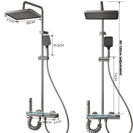 Karštas Šaltas Dušo Rinkinys Maišytuvas – Skaitmeninis Temperatūros Rodmuo: Poliruoto žalvario karštas ir šaltas dušo rinkinys su kvadratiniu dušo galvute ir integruotu skaitmeniniu temperatūros rodmeniu, užtikrinančiu tikslius, patogius dušus.