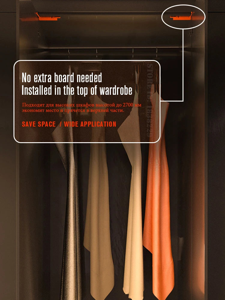 - Paslėptas, universalus dizainas: Idealiai tinka tiek mažoms spintoms, tiek didelėms drabužinėms; išlaiko paviršius švarius ir tvarkingus.