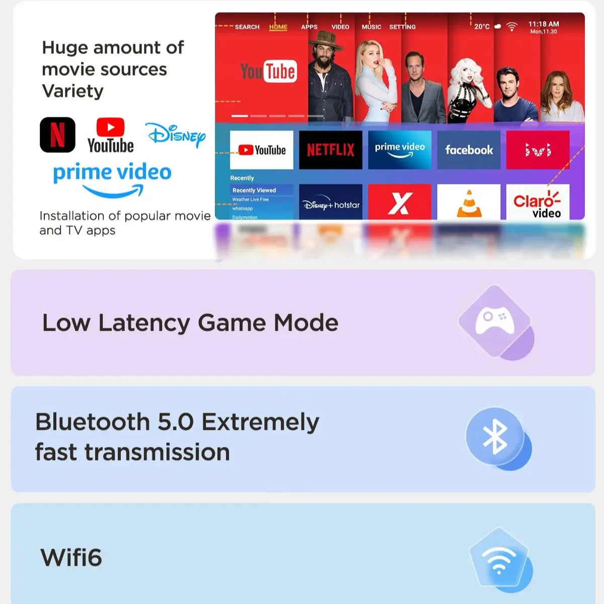 - Rezoliucija: Natūrali 1920x1080p, palaiko 4K dekodavimą su AI patobulinimais, užtikrinančiais aukštesnę spalvą ir aiškumą.