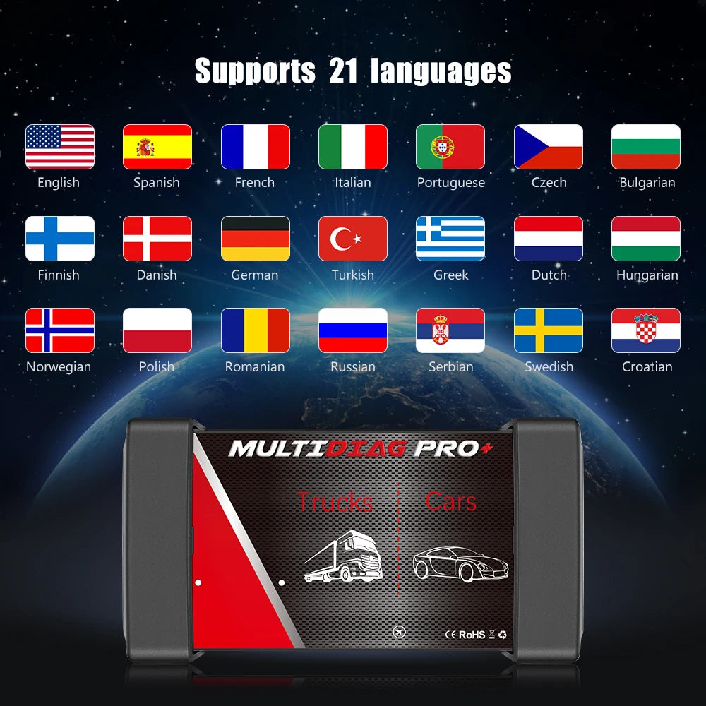 Multidiag Pro V3 siūlo plačią kalbų palaikymą, įskaitant anglų, ispanų, prancūzų, italų, portugalų, čekų, bulgarų, suomių, danų, vokiečių, turkų, graikų, olandų, vengrų, norvegų, lenkų, rumunų, rusų, serbų, švedų ir kroatų (21 kalba). V5.008 R2 versija palaiko anglų, ispanų, prancūzų, čekų, olandų, vokiečių, vengrų, italų, portugalų, lenkų (10 kalbų; numatytoji anglų + prancūzų).