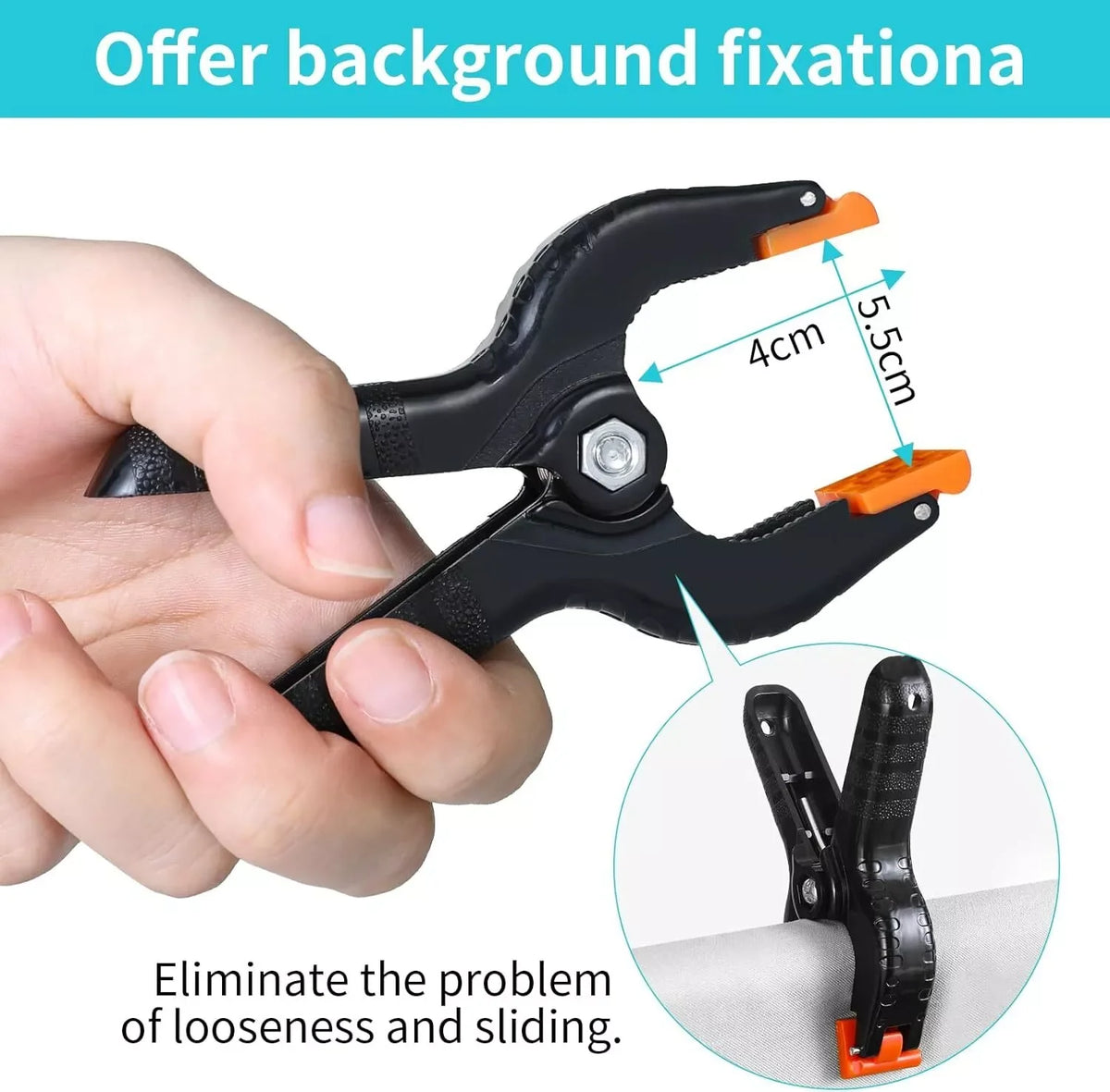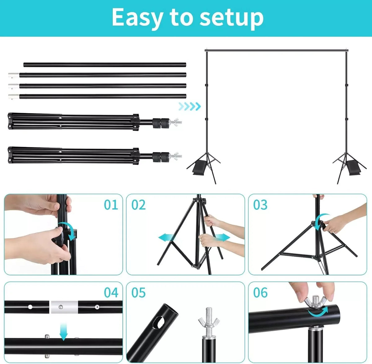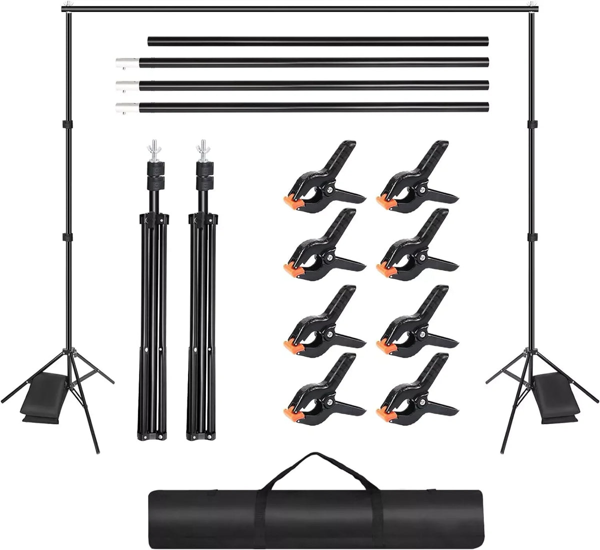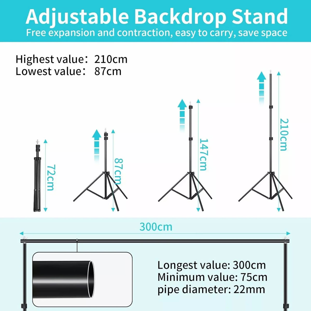 Pagrindinės savybės, tokios kaip ištraukiamos skersinės, leidžia pritaikyti fono plotį skirtingoms scenoms, o reguliuojamas aukštis (iki 210 cm) suteikia jums lankstumo fotografuoti sėdint, stovint ar lauke. Tripodo pagrindo dizainas užtikrina, kad stovas išliktų stabilus net ir visiškai ištemptas, todėl galite sutelkti dėmesį į tobulų kadrų fiksavimą, o ne gaudyti judėjimą. Rinkinys apima 8 fono spaustukus, kad saugiai pritvirtintumėte muslinus, audinius, popierių ar drobę, ir praktišką nešimo maišą lengvam transportavimui tarp fotosesijų.