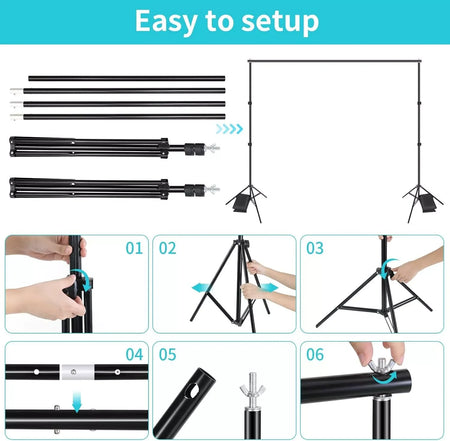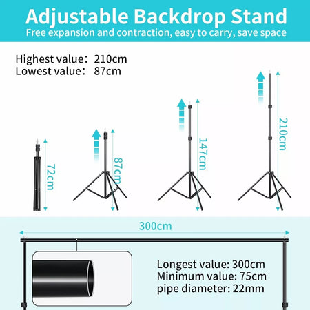 Susipažinkite su Aliuminio Foto Studijos Fone Stovu 3x2.1m Reguliuojamu — tvirta, lengva fono sistema, sukurta sklandžiai portretų fotografijai ir kūrybiniams šūviams. Pagamintas iš patvaraus aliuminio ir užbaigtas klasikinės juodos spalvos, šis stovas užtikrina patikimą stabilumą ir greitą paruošimą švariems, profesionaliems fonams bet kurioje erdvėje.