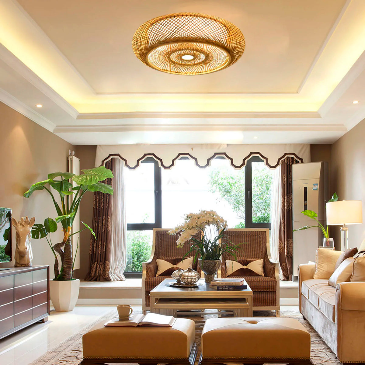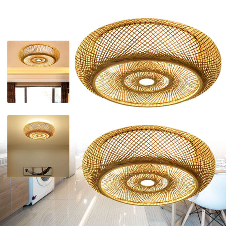 Rūpestingas Bambuko Lubų Šviestuvas – Rankų Darbo Bubinas — Šiltas, ekologiškai įkvėptas lubų šviestuvas, kuris sujungia rankų darbo bambuko meistrystę su praktišku apšvietimu svetainėms, valgomojo erdvėms ar jaukiems komerciniams plotams.