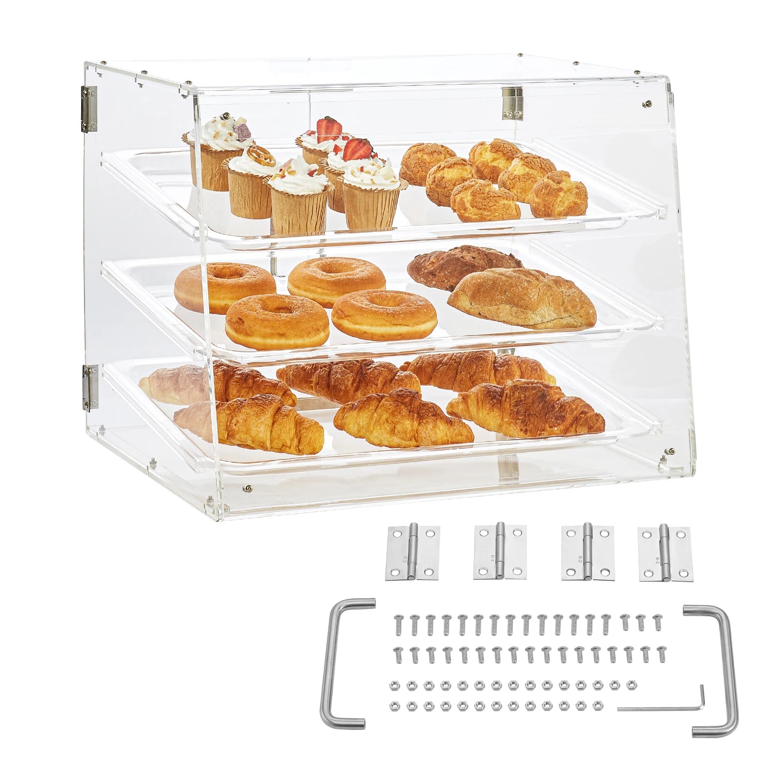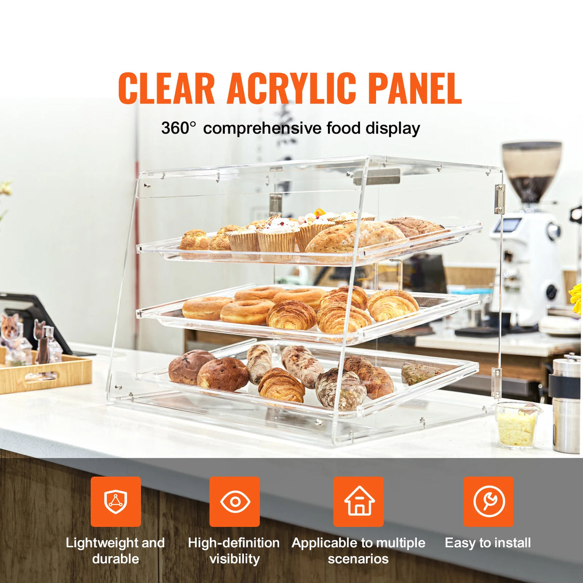 Su dviem erdviais lentynomis ir skaidriu akrilo rėmu, jūsų pyragai, duonos ir saldumynai išlieka matomi iš kelių kampų, skatindami klientus užsibūti ir pirkti. Kompaktiškas, universalus dizainas tinka ant prekystalių arba už prekystalių, todėl tai praktiškas priedas kavinėms ir turgams, norintiems pagerinti produktų pateikimą.