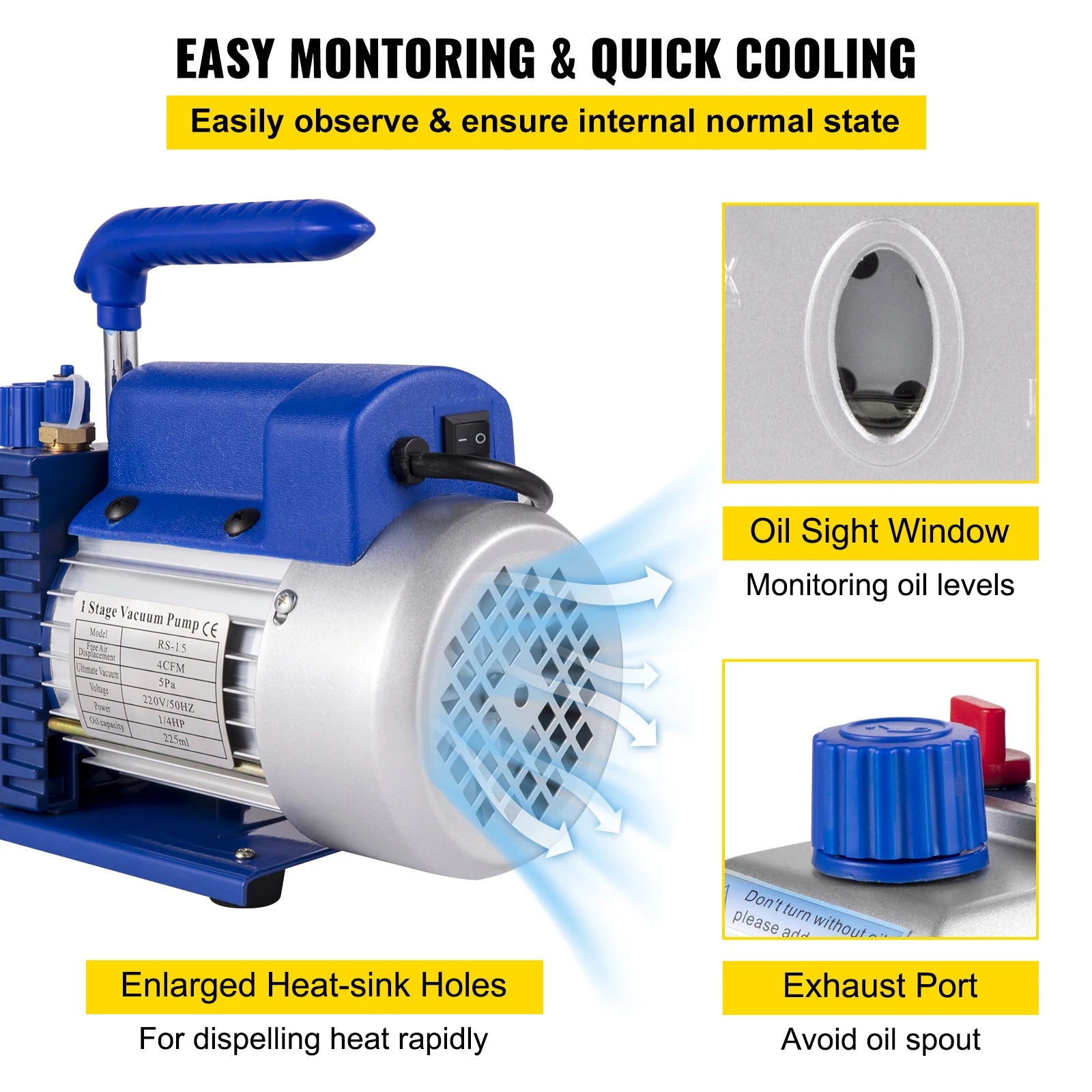 4CFM Etapas Siurblio Rinkinys – Aukšta Efektyvumas — Kompaktiškas elektrinis vakuuminis siurblys, teikiantis 4 CFM siurbimo greitį ir patikimą 5 Pa galutinį vakuumą HVAC evakuacijai, šaldymo paslaugoms, laboratoriniams darbams ir pomėgių projektams.