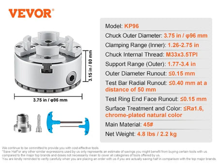 Susipažinkite su 4 Jaw Lathe Chuck, savisukantis chuck, sukurtas tikslumui ir patvarumui metalo apdirbime, medžio apdirbime ir mažo masto gamyboje. Prieinamas dviejų išorinių diametrų (2.75" ir 3.75"), jis tinka įprastiems ašies dydžiams, tuo pačiu užtikrindamas stabilų, pakartotinį fiksavimą plačiam darbo detalių spektrui. Pagamintas iš didelio stiprumo #45 plieno ir chromuotas, kad būtų atsparus rūdims, šis chuck yra sukurtas kasdieniam dirbtuvėse naudojimui su minimaliais nusidėvėjimais. Visi elektroniniai ir mechaniniai įrenginiai, prietaisai ir mašinos, kuriuos InterCyprus parduoda ES šalims, yra CE sertifikuoti ir turi dvejų metų garantiją.