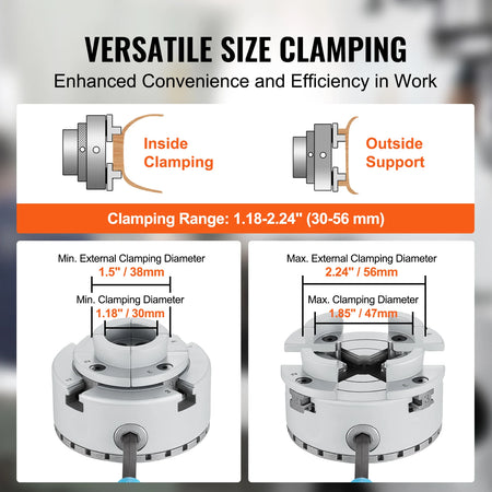 - Patikrinkite, ar prašomas fiksavimo diapazonas yra vidiniame chuck diapazone, kad išvengtumėte pažeidimų ar prasto sukibimo.
