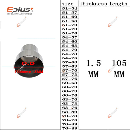 Atnaujinkite ir pritaikykite savo išmetimo sistemą su Universal Stainless Steel Exhaust Reducer Adapter for Straight Pipe by Eplus+. Šis tvirtas, suvirintas adapteris sujungia skirtingus vamzdžių skersmenis, kad užtikrintų švarų, saugų ryšį nuo 51 mm iki 89 mm, todėl jis yra universalus pasirinkimas tiek automobiliams, tiek motociklams.