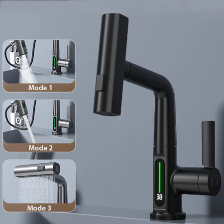 Waterfall Basin Faucet – Skaitmeninis temperatūros rodmuo — elegantiškas stalo montuojamas vieno skylės maišytuvas, kuris sujungia klasikinį stilių su aiškiu skaitmeniniu temperatūros rodmeniu, leidžiančiu tiksliai kontroliuoti karštą ir šaltą vandenį. Sukurtas kasdieniam patvarumui su nerūdijančio plieno korpusu ir vieno rankenos valdymu.