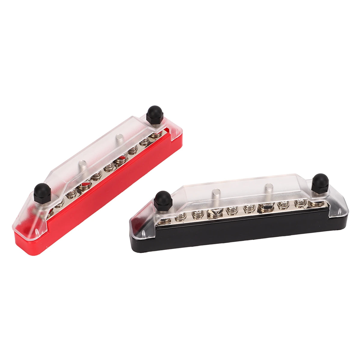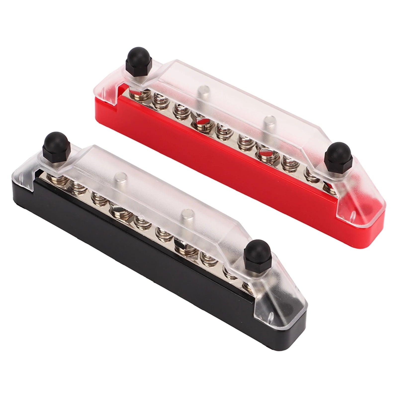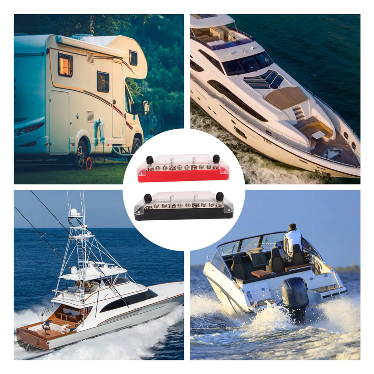 Galvenās specifikācijas: maksimālais spriegums 300V AC / 48V DC un maksimālais nepārtrauktais strāvas stiprums 130A AC / 150A DC. Komplektā ietilpst 4 M6 pieslēguma skrūves un 6 M4 skrūvju gali, kas ir saderīgi ar 1/4 collu un M8 izolējošajiem gredzenu termināliem. Krāsu varianti ietver sarkano un melno sadales bloku, lai atvieglotu ātru pozitīvo/negatīvo identifikāciju. Piemērots automašīnām, kravas automašīnām, kuģiem, jahtām un citām vidēm, kur uzticama jaudas sadale ir būtiska.