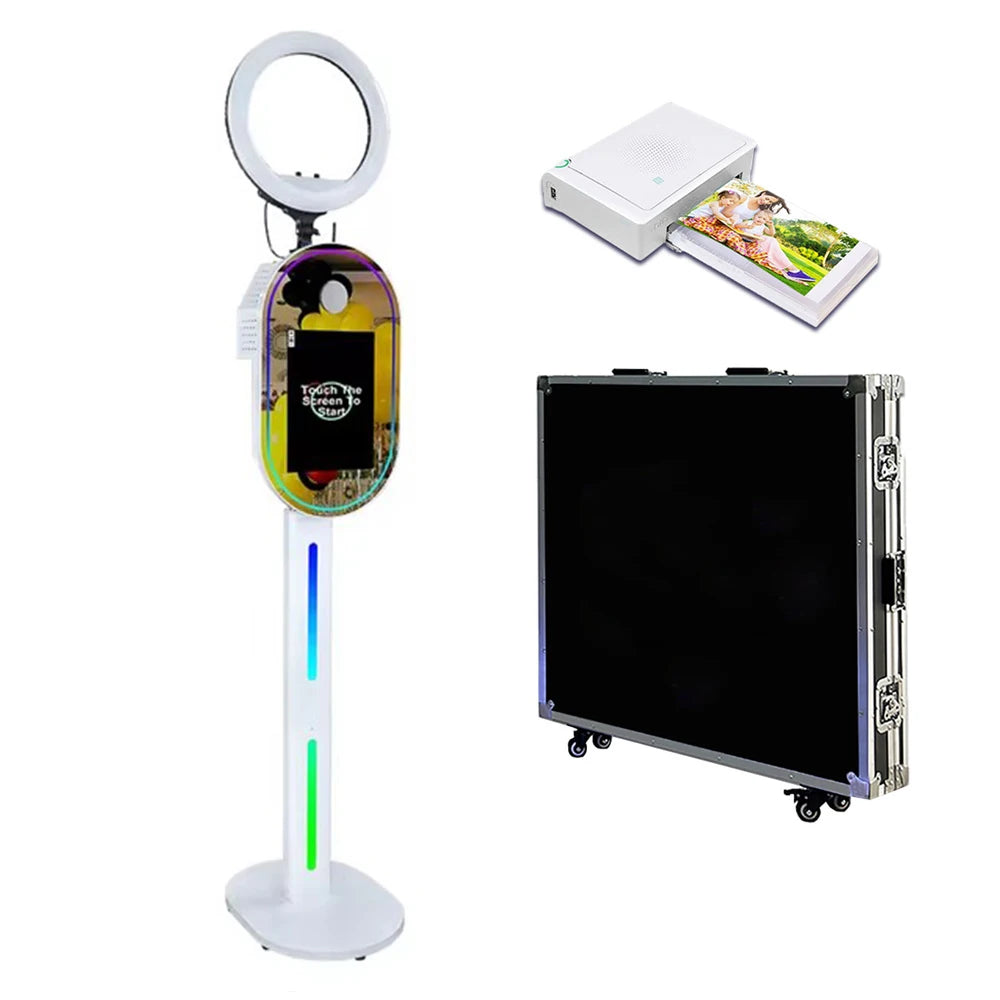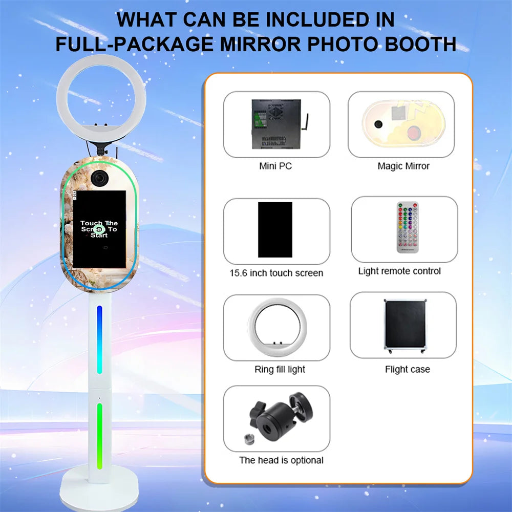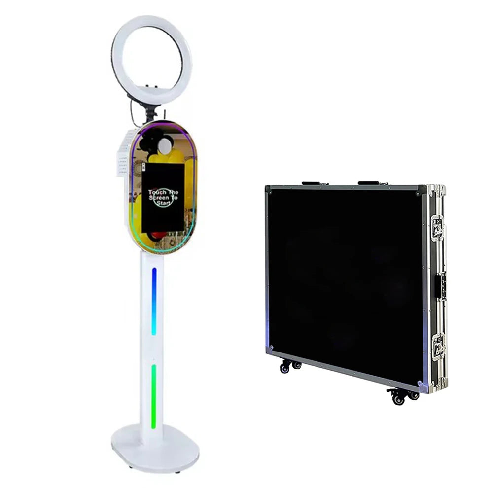 Paaugstiniet pasākumus ar 15.6 collu skārienekrāna burvju spoguļa foto kabīni, kas aprīkota ar RGB gaismām. Šis acīmredzamais spogulis aicina viesus mijiedarboties, uzņemt glaimojošas selfies un radīt dalāmus atmiņas kāzās, ballītēs, festivālos, korporatīvos pasākumos un nomas vietās. Pārsteidzošais dizains un RGB apgaismojuma mirdzums piešķir katram kadram greznu pieskārienu.