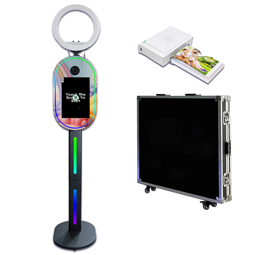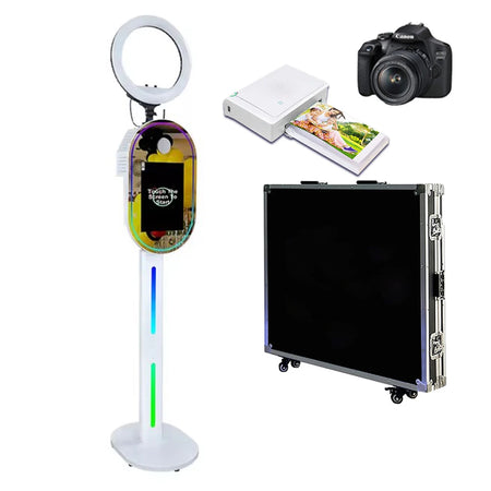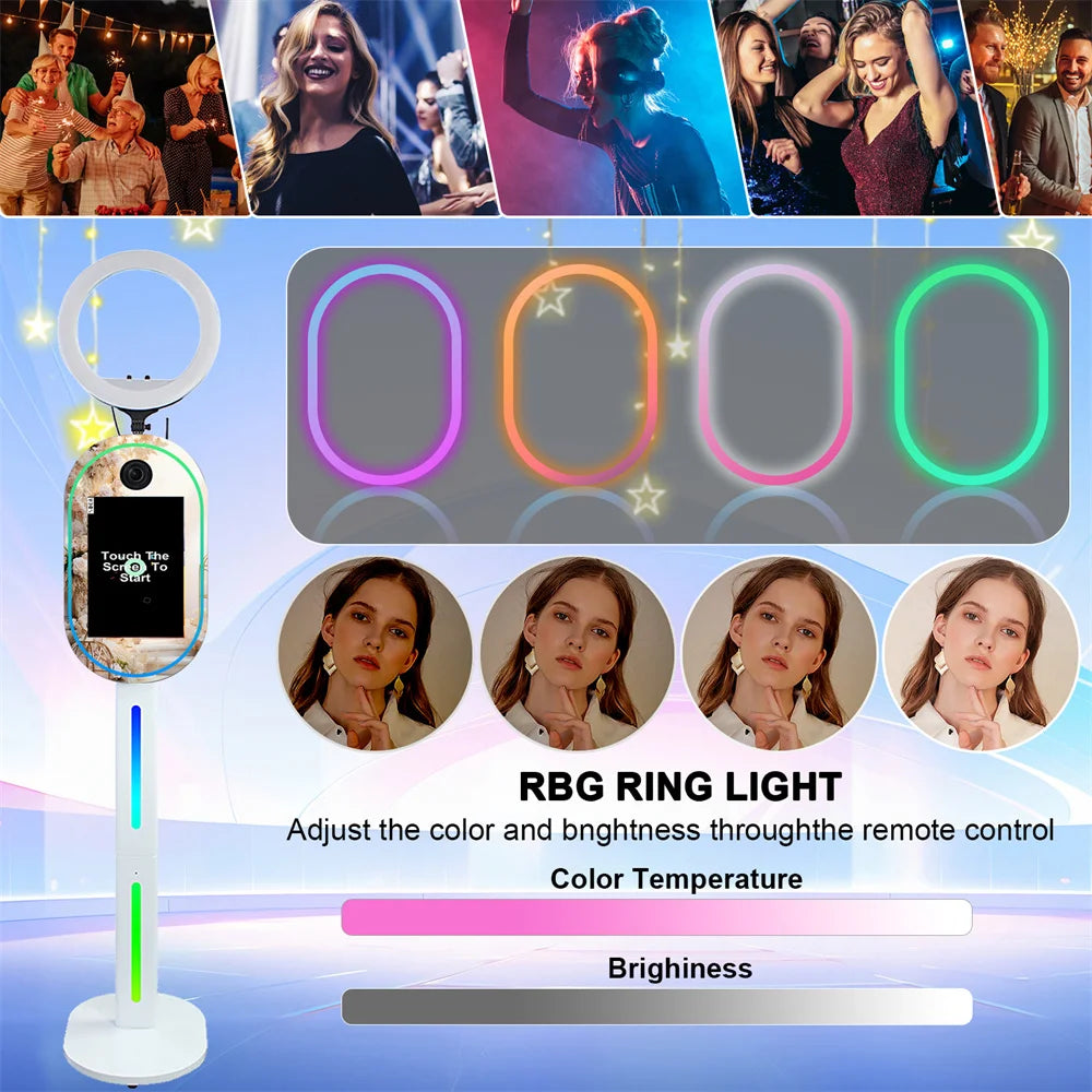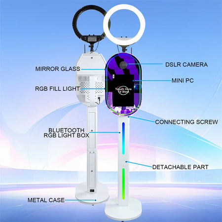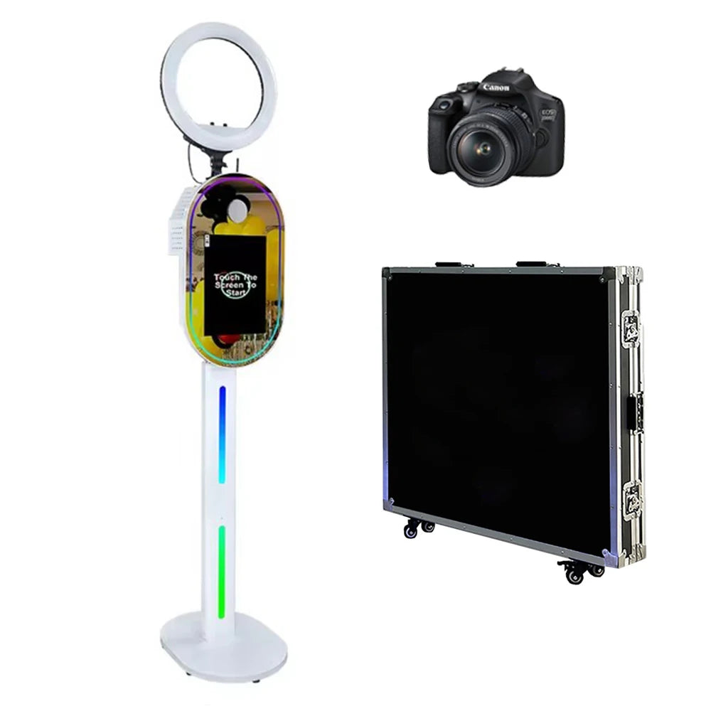 Paaugstiniet pasākumus ar 15.6 collu skārienekrāna burvju spoguļa foto kabīni, kas aprīkota ar RGB gaismām. Šis acīmredzamais spogulis aicina viesus mijiedarboties, uzņemt glaimojošas selfies un radīt dalāmus atmiņas kāzās, ballītēs, festivālos, korporatīvos pasākumos un nomas vietās. Pārsteidzošais dizains un RGB apgaismojuma mirdzums piešķir katram kadram greznu pieskārienu.
