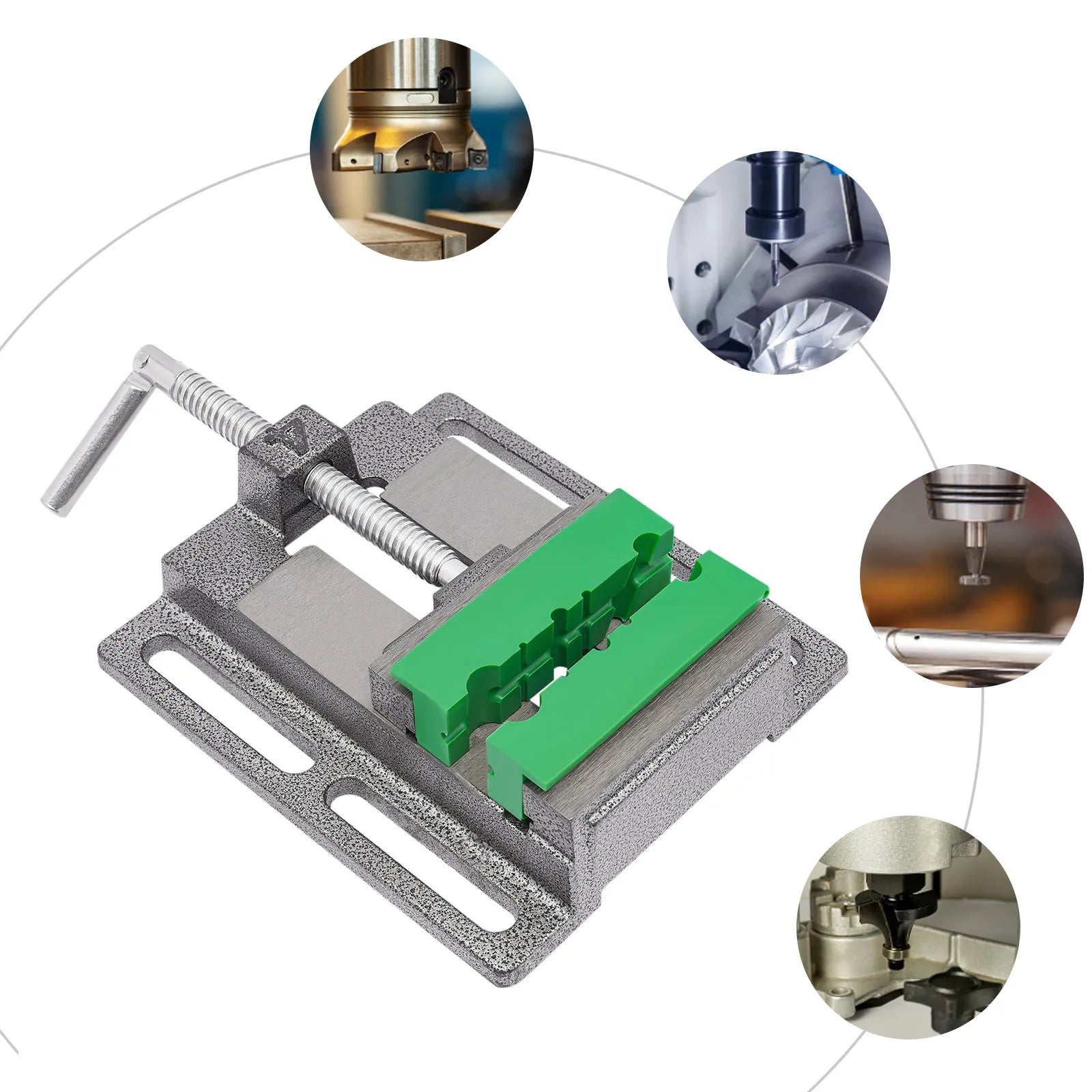 4 collu urbšanas preses skava – neslīdoši zobu formas žokļi un pamatne ir kompakta, smaga skava, kas paredzēta mazu darba gabalu drošai turēšanai urbšanas preses, vieglās kokapstrādes un elektronikas uzdevumos. Izstrādāta precizitātei un izturībai, tās neslīdošie zobu formas žokļi un stabilā pamatne uzlabo drošību un precizitāti atkārtotu urbšanas operāciju laikā.