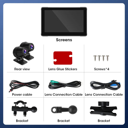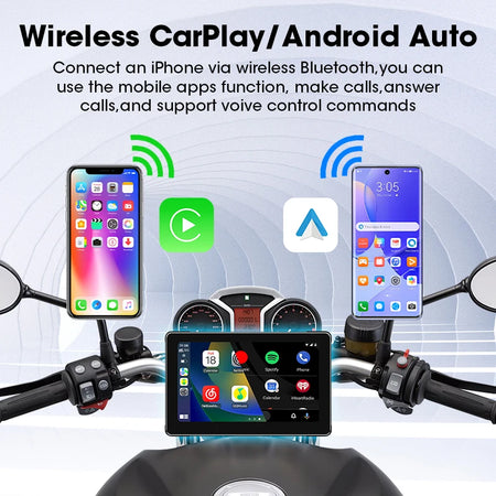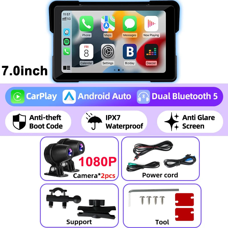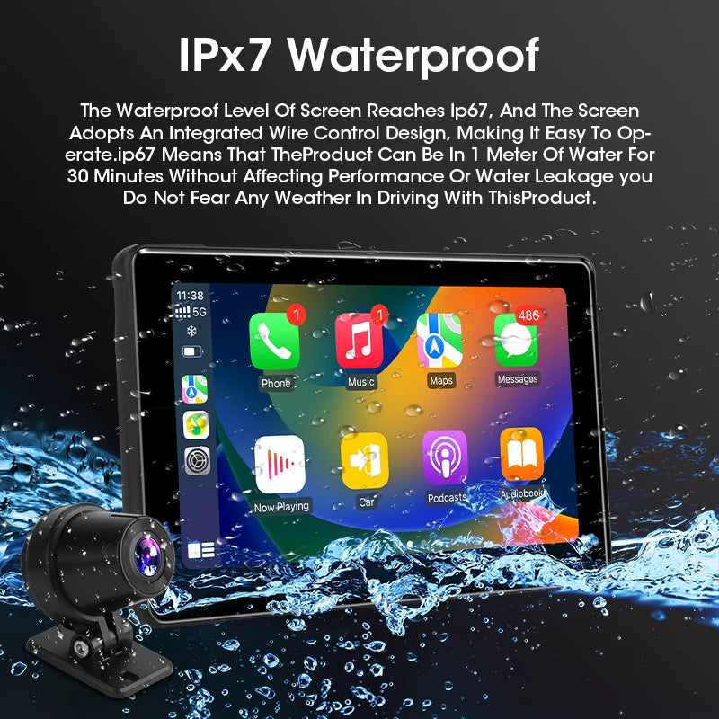 Monitors ir IP67 ūdensizturīgs, kamera ir IP67 ūdensizturīga, un kameras josta ir IP65 ūdensizturīga, nodrošinot izturīgu aizsardzību pret mitrumu un lietu visos braukšanas apstākļos. 7 collu displejs, ko baro daudzpusīgs 7-32V ieejas spriegums, ir paredzēts gan motocikliem, gan transportlīdzekļiem, ar Bluetooth un WiFi bezvadu savienojamībai un bezvadu CarPlay/Android Auto pieredzei. Izbaudiet automātisko spilgtumu, regulējamu displeju, brīvroku vadību un ērtu datuma/laika zīmogošanu, kamēr braucat vai vadāt.