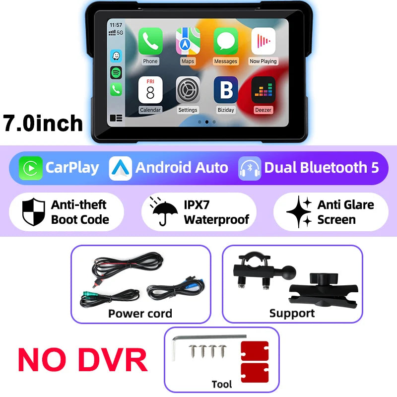 Iepriekš iepazīstieties ar 7 collu GPS navigāciju motociklam no Develuck — portatīvu, IPX7 ūdensizturīgu ekrānu, kas nodrošina bezvadu CarPlay un Android Auto jūsu braucienam. Augsta kontrasta IPS displejs nodrošina spilgtas krāsas un asus detaļas, nodrošinot, ka kartes un multivide ir viegli lasāmas ceļā. Komplektā ir universāls statīvs elastīgai uzstādīšanai motociklos, automašīnās vai kravas automašīnās, ar vairākiem montāžas variantiem, lai atbilstu jūsu vēlmēm. Izmantojiet CarPlay, lai bezvadu režīmā skatītu navigāciju, ziņojumus un mūziku no sava iPhone; izmantojiet Android Auto, lai atspoguļotu lietotnes navigācijai un multividei no sava Android telefona. Ierīce atbalsta atmiņas kartes paplašināšanu (līdz 128GB) bezsaistes kartēm un video, kā arī priekšējo/aizmugurējo kameru ieejas uzlabotai drošībai.