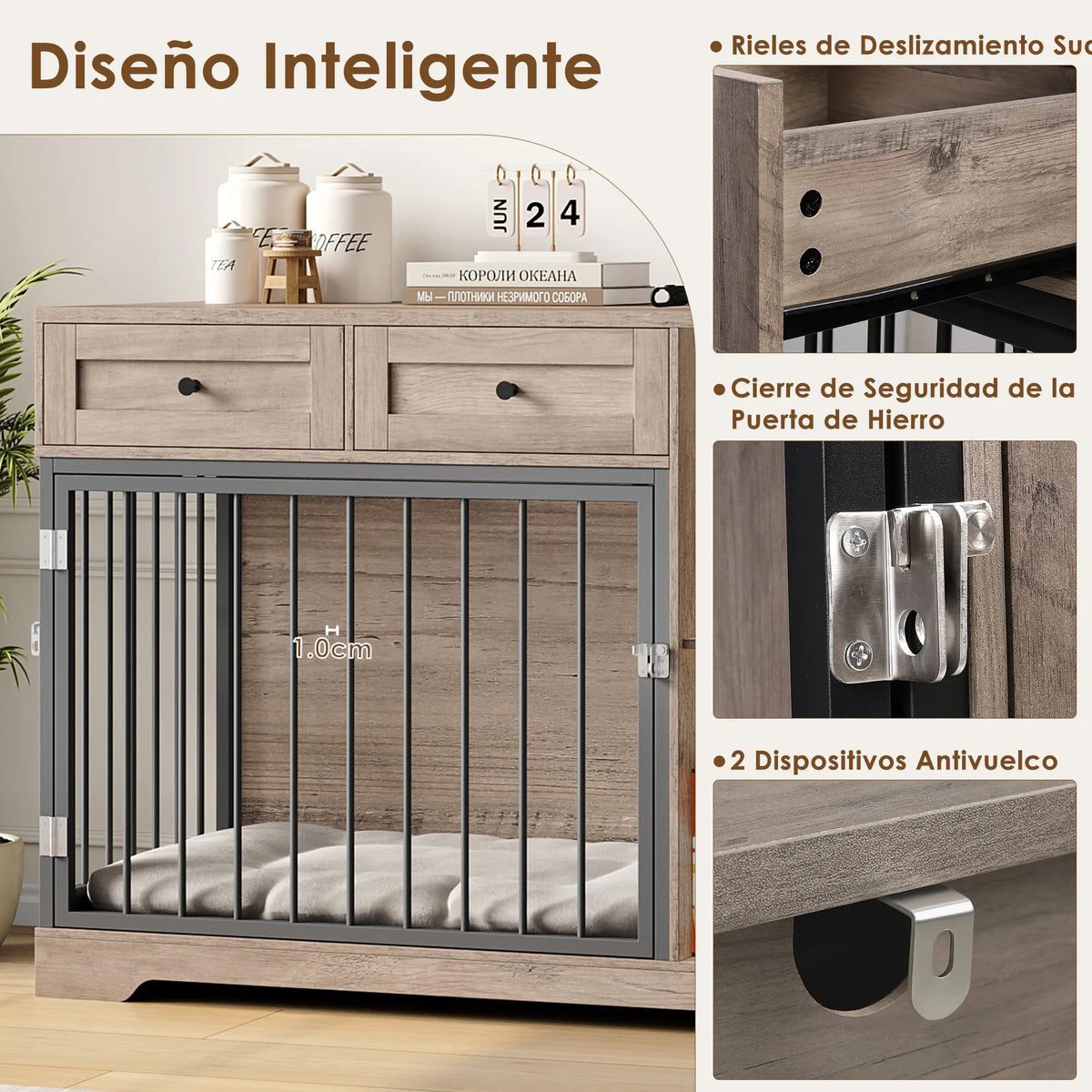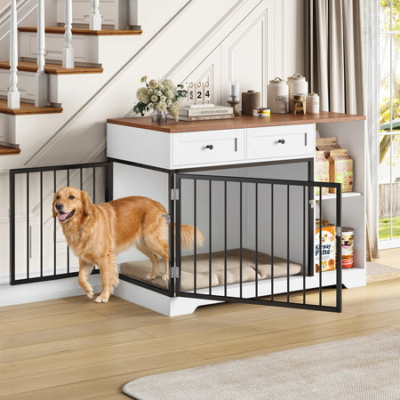 - Izmantojiet kā plašu, ērtu būri vidēja izmēra sunim, vienlaikus saglabājot barošanas un spēļu priekšmetus kārtīgi organizētus iebūvētajā uzglabāšanā.