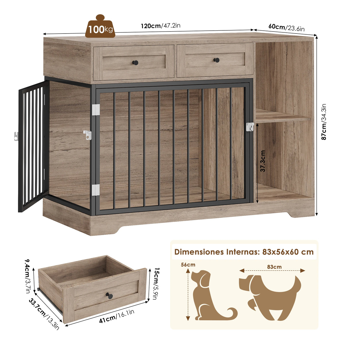 Daudzfunkcionālas mēbeles moderniem interjeriem. Neatkarīgi no tā, vai jums nepieciešams veltīts būris jūsu sunim, funkcionāla bufete vai TV skapītis, šis gabals pielāgojas dažādām telpām un stiliem. Tā plašie izmēri nodrošina jūsu sunim vietu atpūtai un kustībai, kamēr elegants dizains uzlabo jūsu mājas dekoru.
