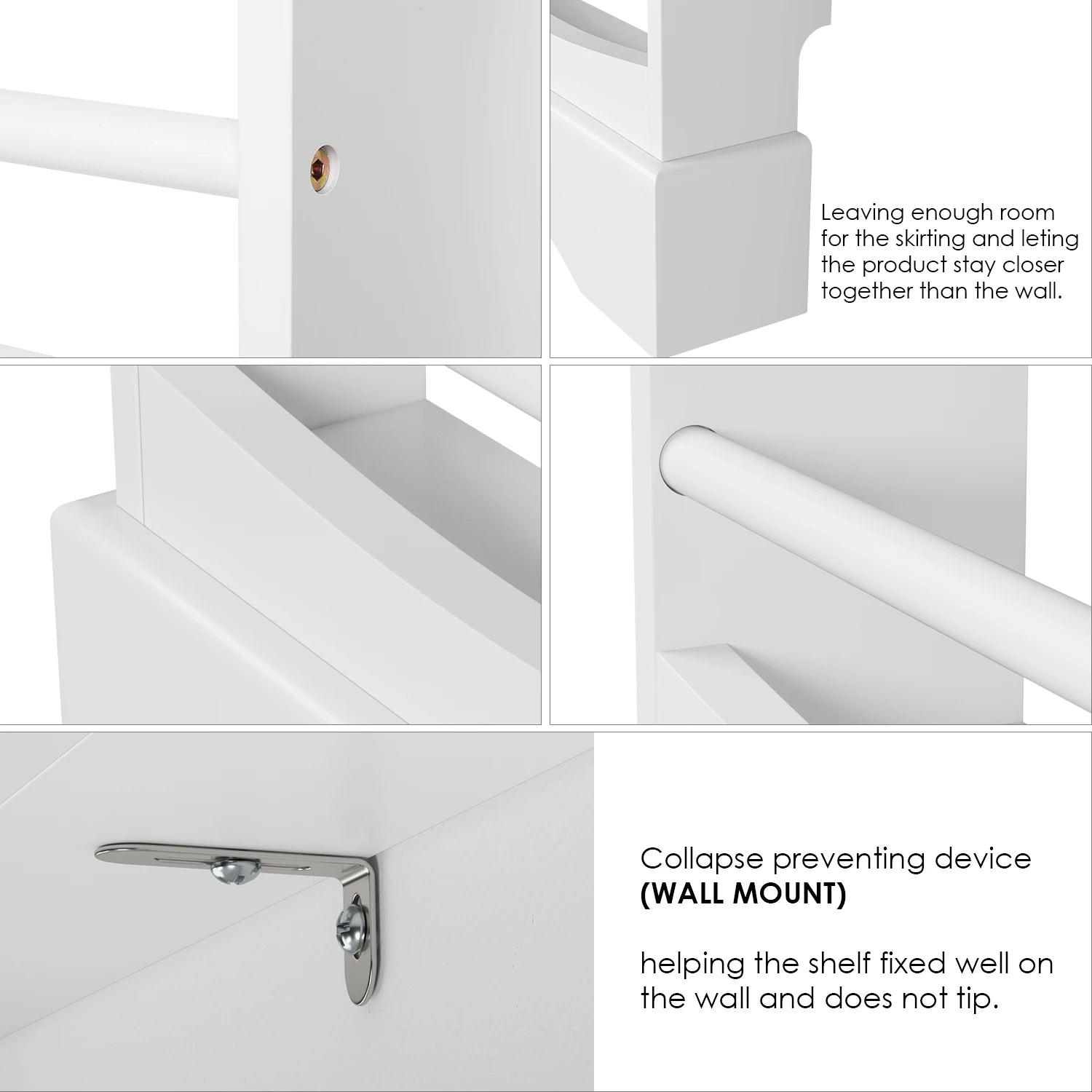 Drošība un stabilitāte ir svarīgas: slīpuma aizsardzība ļauj pievienot grāmatu plauktu pie sienas papildu stabilitātei ar slīpuma aizsargu. Četri metāla caurules palīdz novērst grāmatu apgāšanos, kamēr izturīgā viļņotā pamatne nodrošina uzticamu pamatu. 4 slāņu plaukta dizains piedāvā pietiekami daudz vietas, un noapaļotie stūri samazina triecienu risku spēlējoties. Pabeigts tīrā, modernā baltā krāsā, tas skaisti iekļaujas jebkurā BĒRNU istabā, spēļu istabā, viesistabā, guļamistabā vai gaitenī.