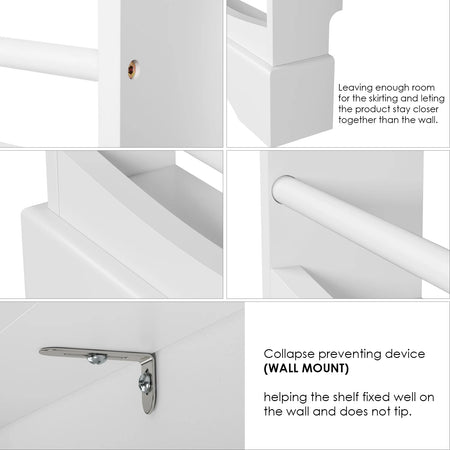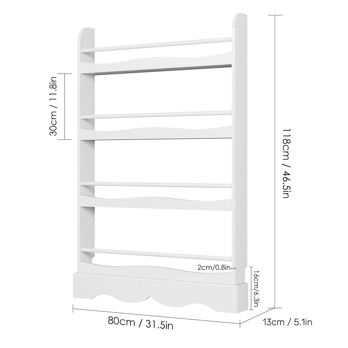 Izmēri un materiāli atbilst praktiskai ģimenes dzīvei: 80 x 13 x 118 cm (Garums x Platums x Augstums), izgatavots no MDF dēļa baltā krāsā. Plāksnes biezums ir 15 mm, nodrošinot izturību ikdienas lietošanai. Izcelsme: Ķīnas kontinentālā daļa. Montāža ir nepieciešama, lai uzstādītu šo plauktu vienību. Dizains ir ideāls, lai mācītu bērniem uzturēt savu telpu kārtīgu un pieejamu.