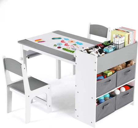 Izstrādāts bērniem vecumā no 3 līdz 8 gadiem un ideāli piemērots spēļu istabām, bērnudārziem vai klasēm, šis komplekts palīdz izveidot veltītu, nekārtīgu mākslas stūri. Galds ietver glabāšanas plauktu vienā pusē un 4 noņemamus glabāšanas rāmjus ar augšējiem nodalījumiem mākslas piederumiem, rotaļlietām un grāmatām. Papīra ruļļa turētājs uz galda virsmas (ar iekļautu 5m/16.4ft rulli) nodrošina, ka topošajiem māksliniekiem nekad netrūkst papīra radošo sesiju laikā.