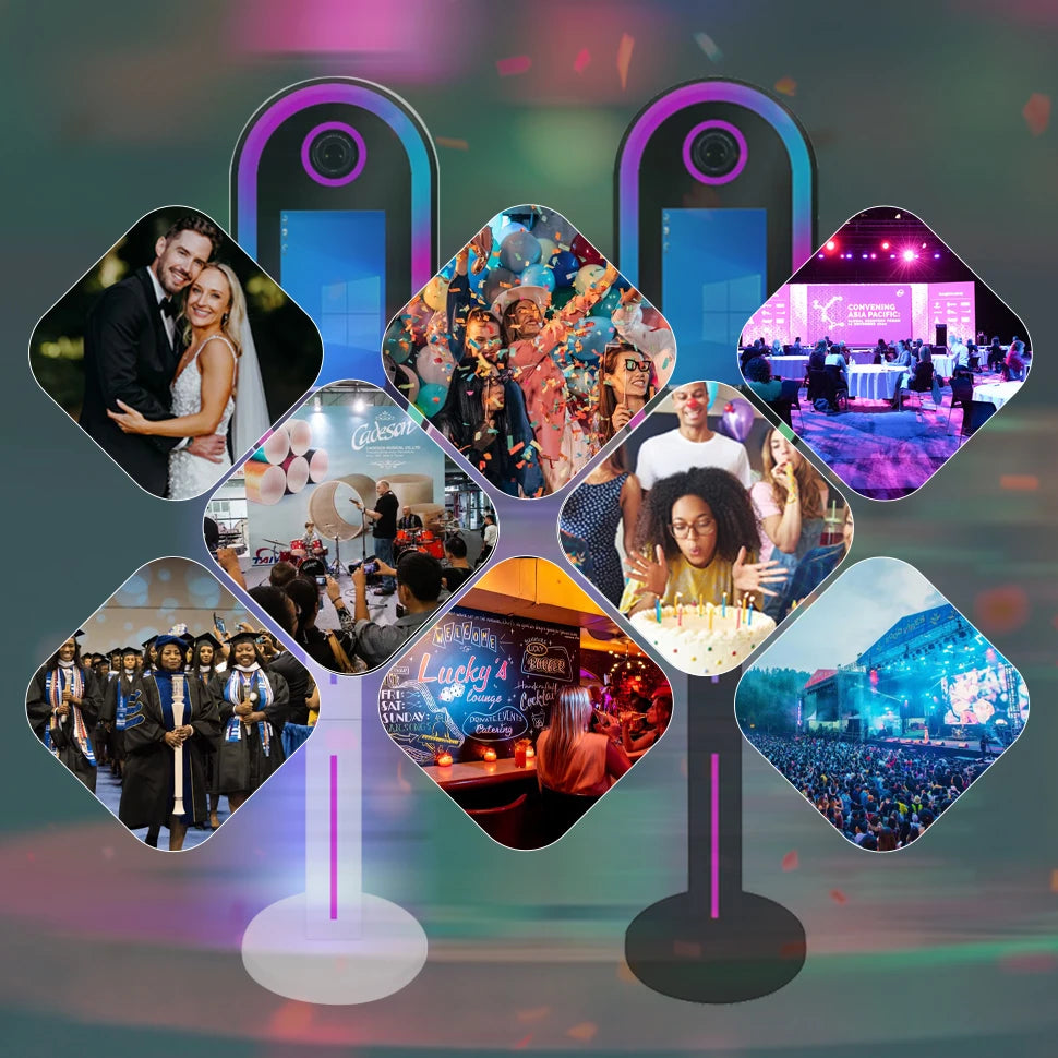 - Uzaiciniet viesus uz interaktīvām selfies, izmantojot LCD skārienekrānu un halo gredzena gaismu dramatiskām, publicēšanai gatavām fotogrāfijām jebkurā pasākumā.