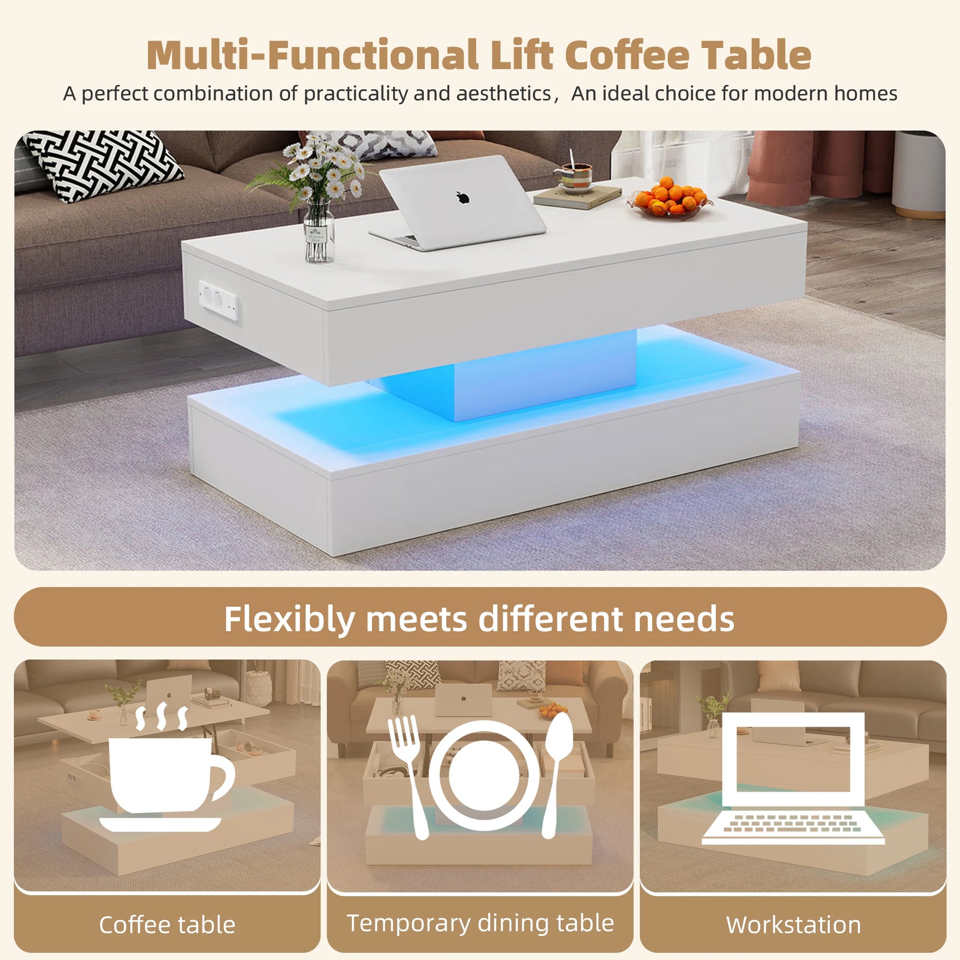 Atklājiet ideālu stila un praktiskuma apvienojumu ar Mūsdienu kafijas galdiņu ar LED apgaismojumu un slēptu uzglabāšanu no Jugacool. Šis mūsdienīgais centrālais elements piedāvā augstuma regulējamu galda virsmu daudzpusīgai lietošanai — vai nu baudot ikdienišķu kafiju, strādājot pie klēpjdatora vai ēdot kopā ar draugiem. Iebūvētā LED gaismas josla, ko kontrolē ar Bluetooth, izmantojot viedtālruņa lietotni, ļauj jums pārslēgties starp tūkstošiem krāsu, pielāgot spilgtumu un izvēlēties dinamiskos gaismas režīmus, lai pielāgotu jebkuras telpas noskaņu. Slēptā uzglabāšanas nodalījums zem pacelšanas virsmas saglabā žurnālus, tālvadības pultis un mazus aksesuārus kārtībā, maksimāli izmantojot vietu kompakto dzīvojamā telpā. Izgatavots no augstas kvalitātes skaidu plāksnes, tas atbalsta līdz 50 kg ikdienas uzticamībai. Integrētās ES kontaktligzdas padara ierīču uzlādi vieglu un drošu, ko nodrošina CE sertifikācija drošībai un veiktspējai. Baltā apdare un tīras līnijas piemērotas jebkuram mūsdienu interjeram, kamēr energoefektīvs apgaismojums palīdz samazināt enerģijas patēriņu.