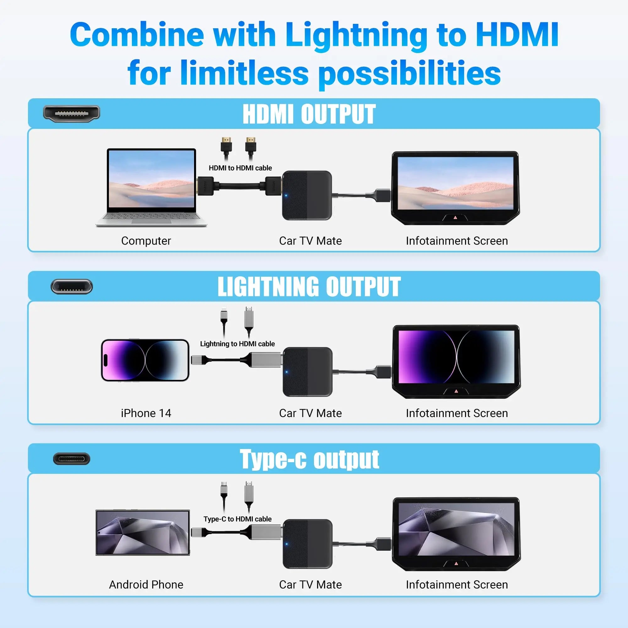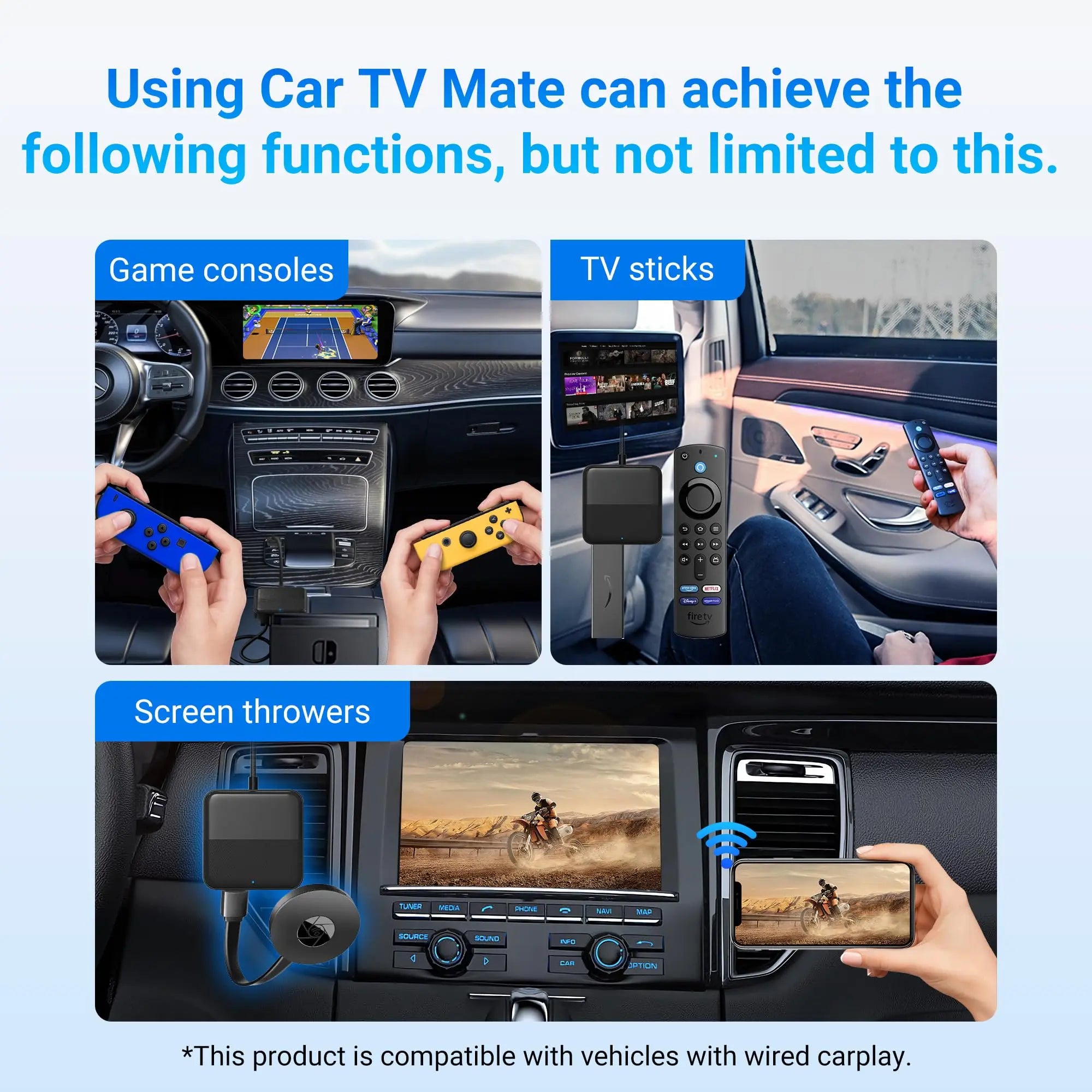 Ar patiesu plug‑and‑play iestatīšanu, tas atbalsta AirPlay un prasa tikai HDMI kabeli, lai projicētu saturu uz jūsu auto ekrāna. Izbaudiet līdz 2K izšķirtspēju 60 Hz, lai iegūtu skaidras vizuālas bildes, un stabilu HDMI savienojamību, kas nodrošina vienmērīgu straumēšanu un spēlēšanu, kamēr jūs braucat. Car TV Mate ir kompakts un izturīgs ar matētu apdari, lai izturētu skrāpējumus, padarot to par praktisku papildinājumu jūsu transportlīdzekļa izklaides sistēmai.