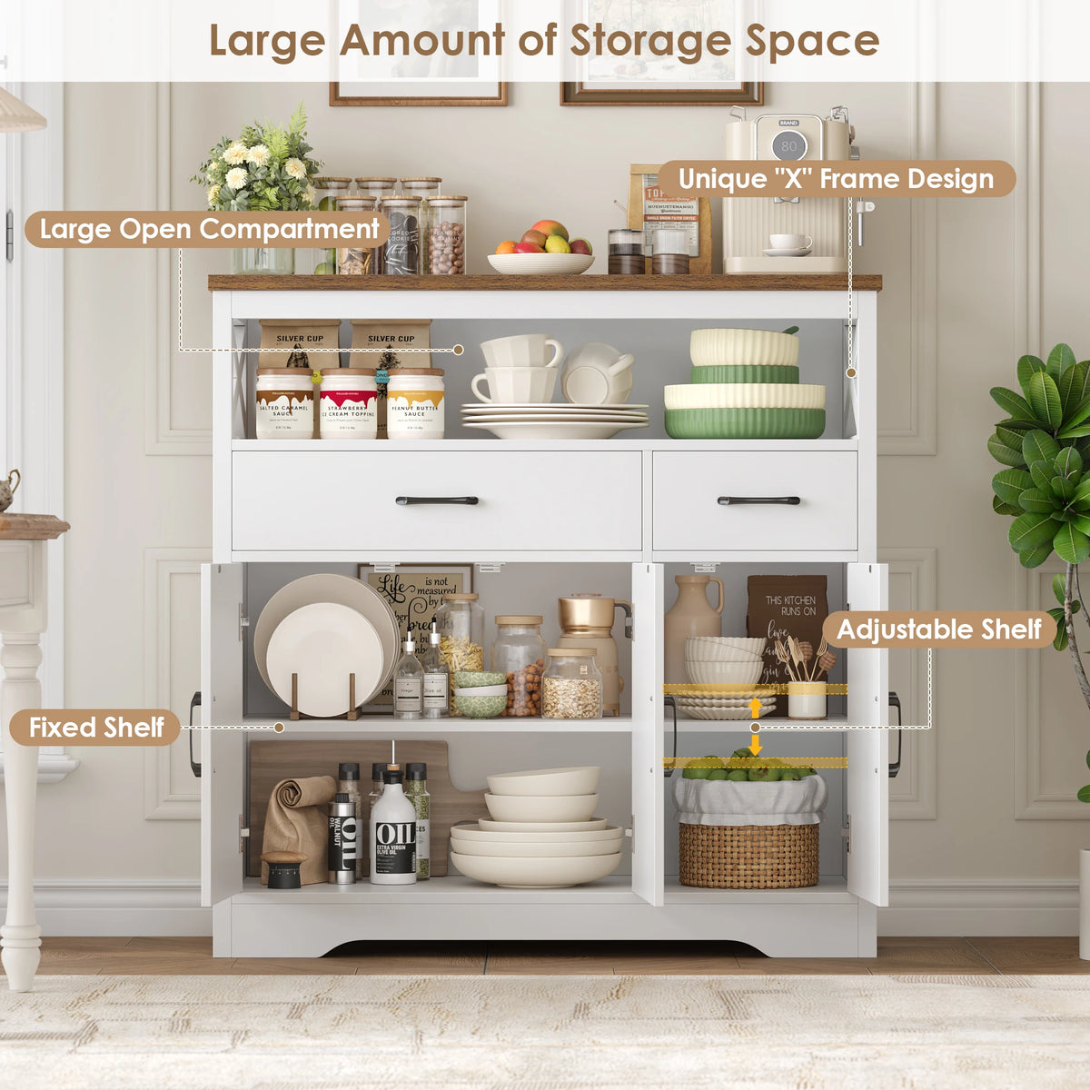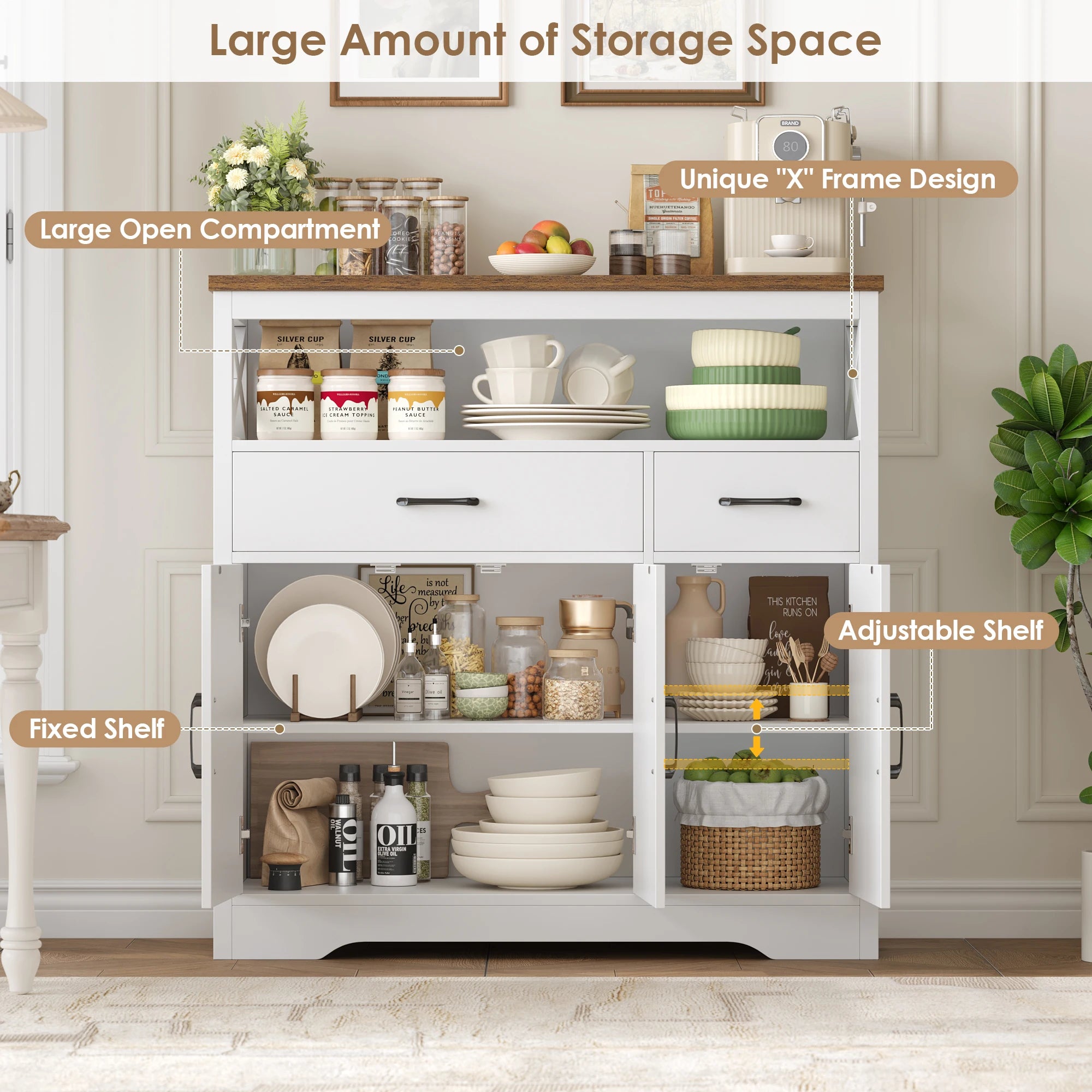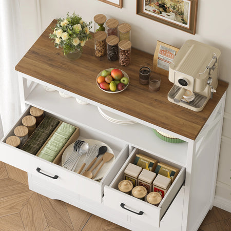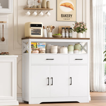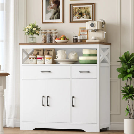 Praktisks un plašs, šis bufete tur ikdienas nepieciešamības kārtībā. Augšējā virsma ir piemērota parastajiem virtuves rīkiem vai izstādes priekšmetiem, kamēr divi dažādu izmēru atvilktnes palīdz sakārtot galda piederumus, salvetes un galda traukus. Aiz trim durvīm ir regulējami plaukti, kas pielāgojas dažādu augstumu priekšmetiem, un atvērtas nodalījumi ar aizmugurējām paneļiem nodrošina ātru piekļuvi bieži lietotiem priekšmetiem, piemēram, vīna glāzēm un piedevām. Ar savu tīro balto ārpusi un rustikā brūnu galda virsmu, tas ir daudzfunkcionāls gabals, kas var kalpot kā bufete, ēdamistabas uzglabāšana vai konsoli viesistabā.