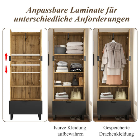 Pārveidojiet savu telpu ar Dabisko skapji ar apģērbu stieni un vienu atvilktni, daudzfunkcionālu uzglabāšanas risinājumu, kas apvieno mūsdienu stilu ar lauku šarmu. Šis skapis piedāvā plašu pakaramā zonu ar izturīgu apģērbu stieni, lai saglabātu mēteļus, jakas un kleitas bez krunkām, kamēr trīs iekšējie plaukti (divi regulējami) pielāgojas jūsu mainīgajām uzglabāšanas vajadzībām. Atvērtais nodalījums apakšā nodrošina ātru piekļuvi atslēgām, somām vai aksesuāriem, un lielā apakšējā atvilktne glabā kurpes vai citas mazākas lietas, lai telpa būtu kārtīga.