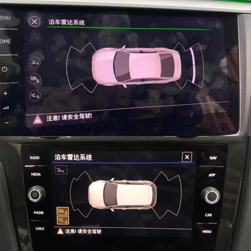 - Automātiskās aktivizācijas funkcijas: Priekšējais radars automātiski aktivizējas D pārnesumā zem 15 km/h; aizmugurējais radars aktivizējas R pārnesumā un darbojas vienlaikus ar priekšējiem sensoriem