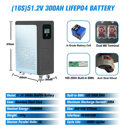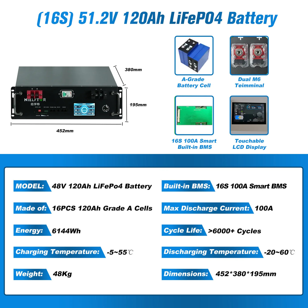 - Nielftor 48V 300Ah LiFePO4 Batterijpakket (16S, 200A BMS)