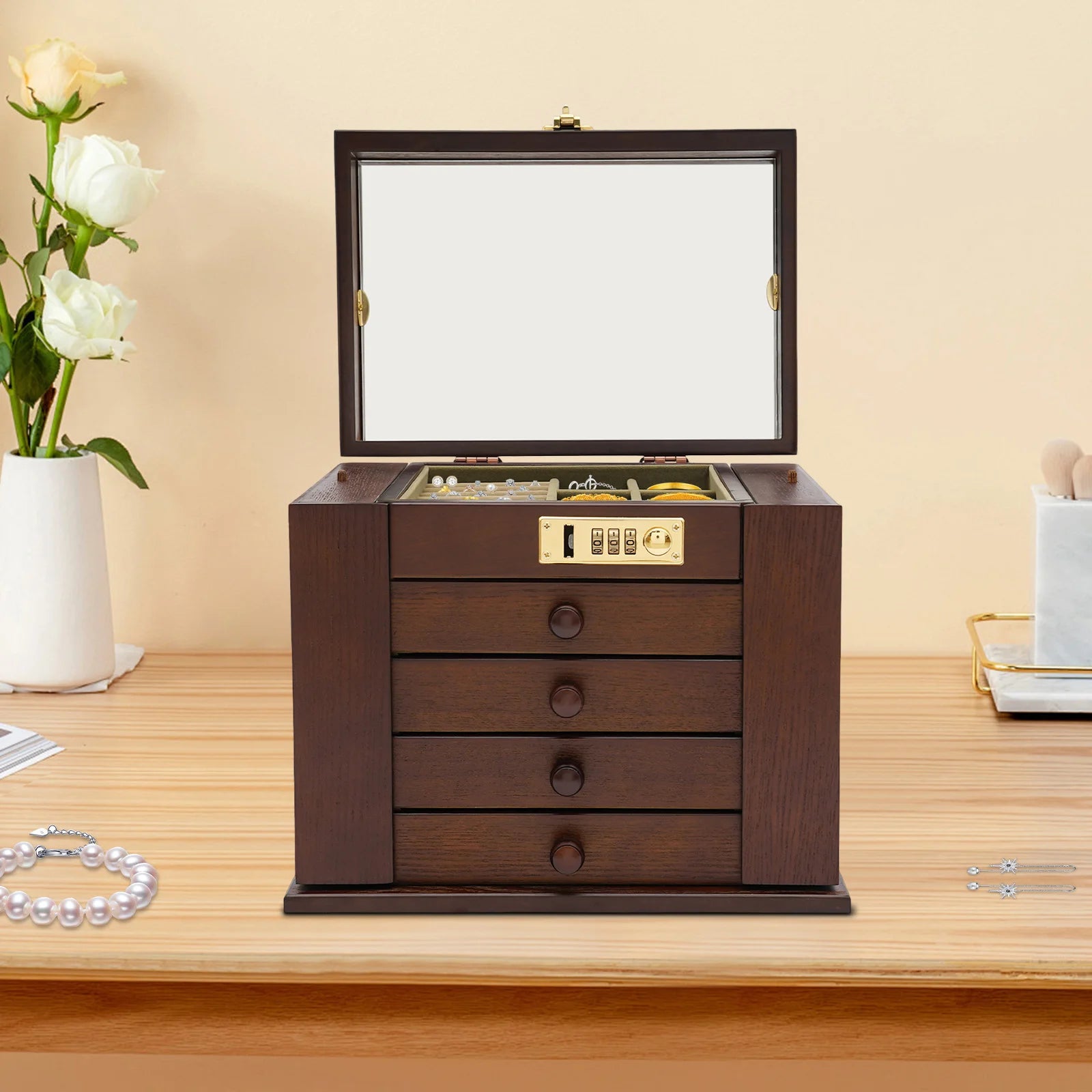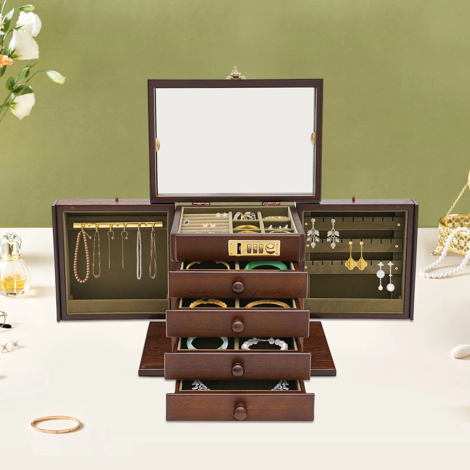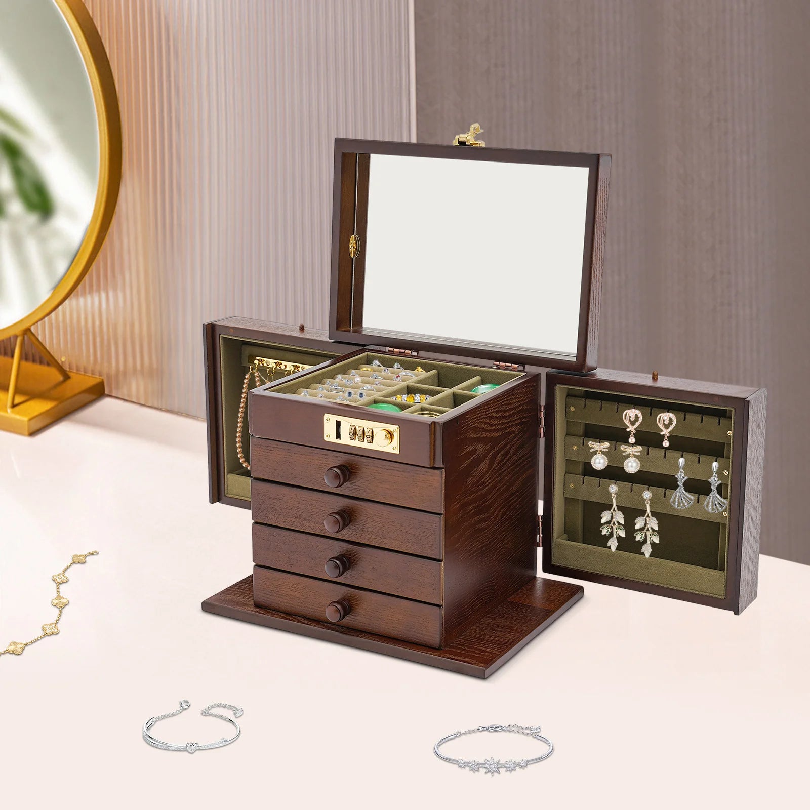 5-laags houten sieradenbox met slot en spiegel – Fluwelen voering — Elegante, veilige opslag voor ringen, oorbellen, kettingen en horloges. Deze 5-laags houten sieradenbox combineert fluwelen gevoerde compartimenten, een ingebouwde spiegel en een slot om je waardevolle spullen georganiseerd en beschermd te houden.