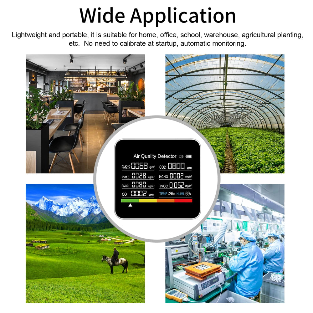 Ontmoet de 9 in 1 Luchtkwaliteitsanalysator CO2 Meter TVOC HCHO PM25 PM10 — een compacte, draagbare multi-sensor detector die real-time metingen biedt voor CO2, CO, TVOC, HCHO, PM2.5/PM1.0/PM10, temperatuur en relatieve luchtvochtigheid. Gebouwd met een hooggevoelige luchtsemiconductorsensor, een infrarood PM2.5 sensor en een elektrochemische sensor, levert dit apparaat nauwkeurige metingen om je te helpen veiligere, gezondere ruimtes te creëren thuis, op kantoor, in de klas, in een magazijn of in de landbouw. Het grote verlichte LCD-scherm maakt het gemakkelijk om metingen in één oogopslag te lezen, terwijl de alarmfunctie je helpt snel te reageren op verslechterende luchtkwaliteit.