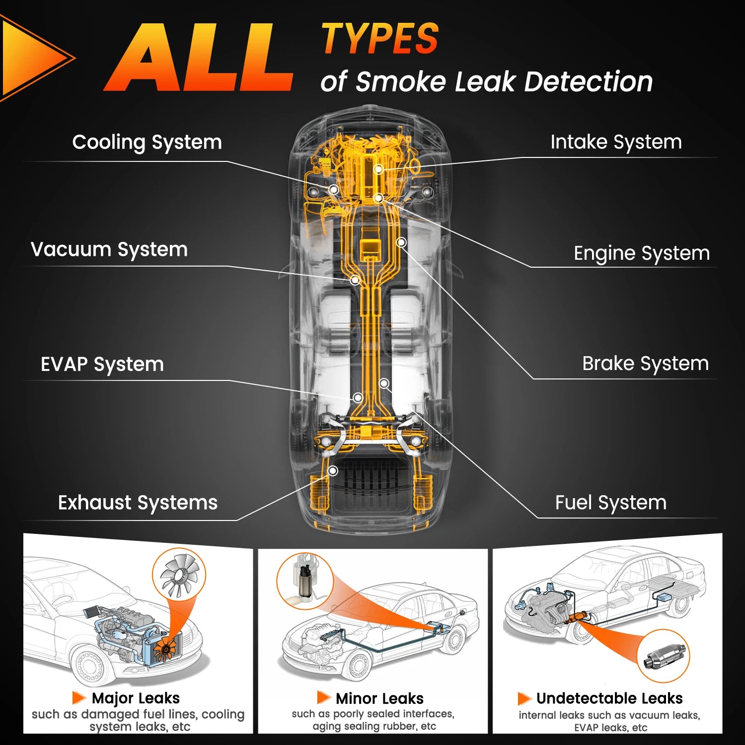 Voordelen: Lokaliseert snel lekken in vacuüm-, inlaat- en carter systemen om de diagnostische tijd te verkorten, inefficiënte motorprestaties te voorkomen en kostbare reparaties te vermijden. De ingebouwde pomp en veiligheidsbescherming maken testen gemakkelijker en veiliger voor monteurs en doe-het-zelvers.