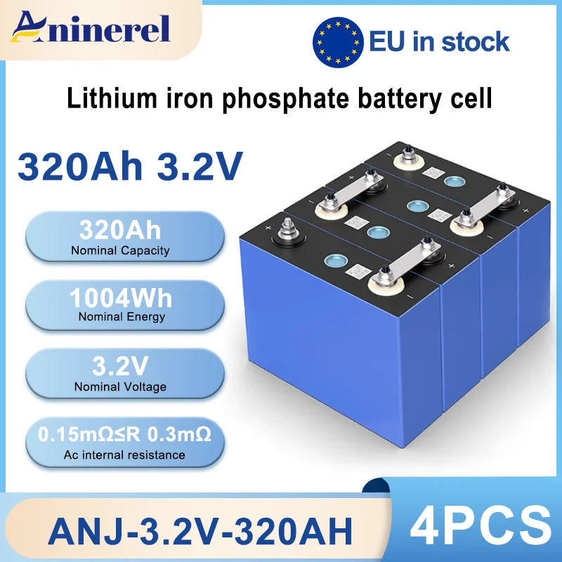 Aninerel 3.2V 320Ah LiFePO4 Batterijpakket 4 Cellen voor 12V 24V 48V Doe-Het-Zelf Thuis Energieopslag