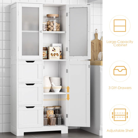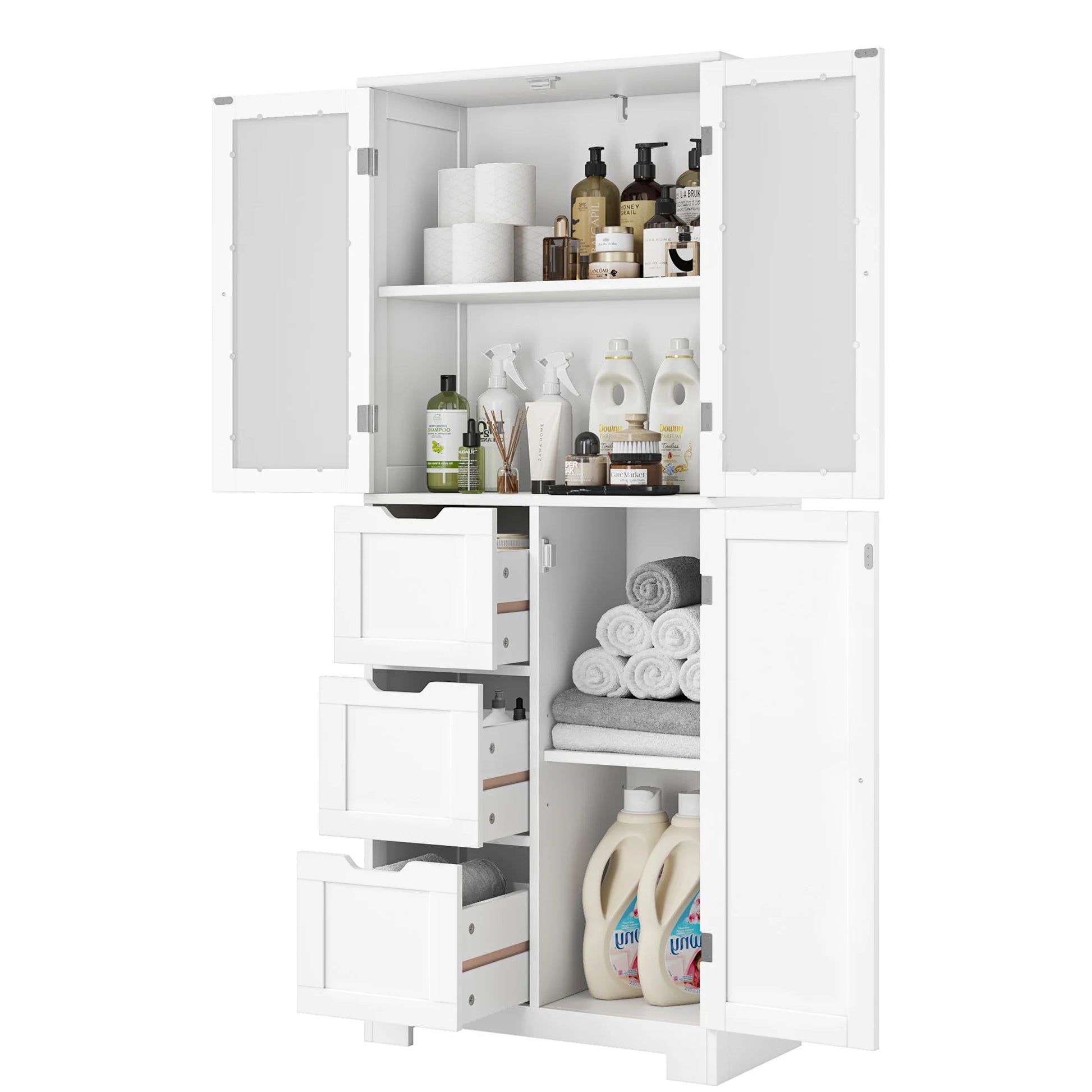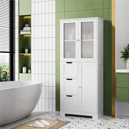 Ontworpen voor flexibiliteit, past deze helderwitte kast goed bij Europees geïnspireerde interieurs en is geschikt voor meerdere kamers. Gebruik het als badkamerkast, boekenkast, multifunctionele kast, ladekast voor de badkamer of zelfs als glazen vitrinekast in de woonkamer. De praktische planken, zowel vast als verstelbaar, bieden ruimte voor items van verschillende formaten, zodat je de opslag kunt aanpassen aan je routine.