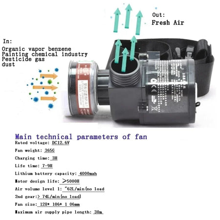 - Constante luchtstroom vermindert de ademinspanning, ideaal voor spuitverven, chemische verwerking, pesticidengebruik en ander werk met organische gassen.