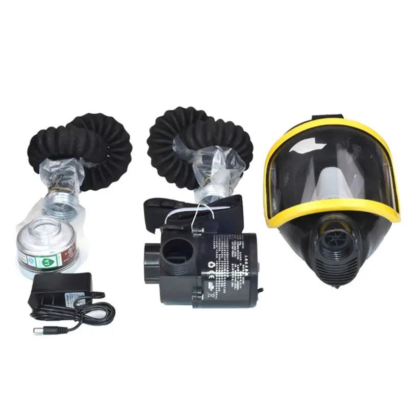 - Optie 4: Gele maskerset: 1 x geel volledig gelaatsmasker, 1 x luchtpomp, 2 x 0,5 m luchtbuis, 1 x actief koolstoffilter, 1 x oplader