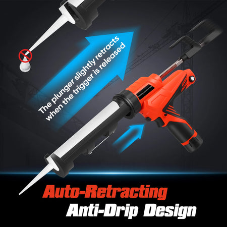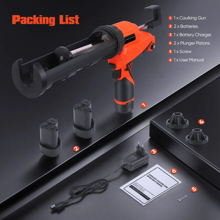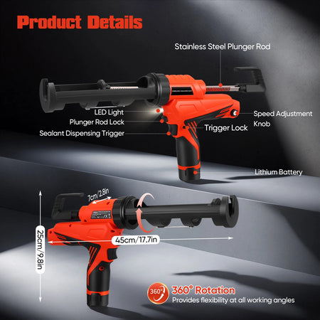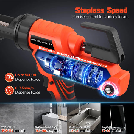 Ervaar moeiteloos kitten met deze draadloze Elektrische Kitpistool, ontworpen voor 10oz/300ml kitpatronen. De traploze snelheidsregeling (0-7,5 mm/s) stelt u in staat de stroom aan te passen voor precieze kitstrengen op tegels, toiletten, ramen en gootstenen. Met een krachtige doseerkracht van 5000N levert het consistente afdichtingen terwijl het handvermoeidheid vermindert dankzij de draadloze werking. Het anti-drup ontwerp trekt automatisch terug nadat de trekker is losgelaten, waardoor werkoppervlakken schoon blijven. Een ingebouwd LED-licht gaat aan wanneer u de trekker indrukt, waardoor donkere hoeken worden verlicht voor nauwkeurige toepassing. De 360° draaibare kitbuishouder biedt flexibele positionering voor moeilijk bereikbare kieren, en het pakket bevat twee vervangende zuigers en een schroef voor eenvoudig onderhoud. De set wordt geleverd met twee 2000mAh batterijen, die tot 200 patronen aankunnen, voor lange gebruikstijden tussen oplaadbeurten. Kleur: oranje en zwart. Afmeting: 45x25x7 cm. Gewicht: 1,5 kg.