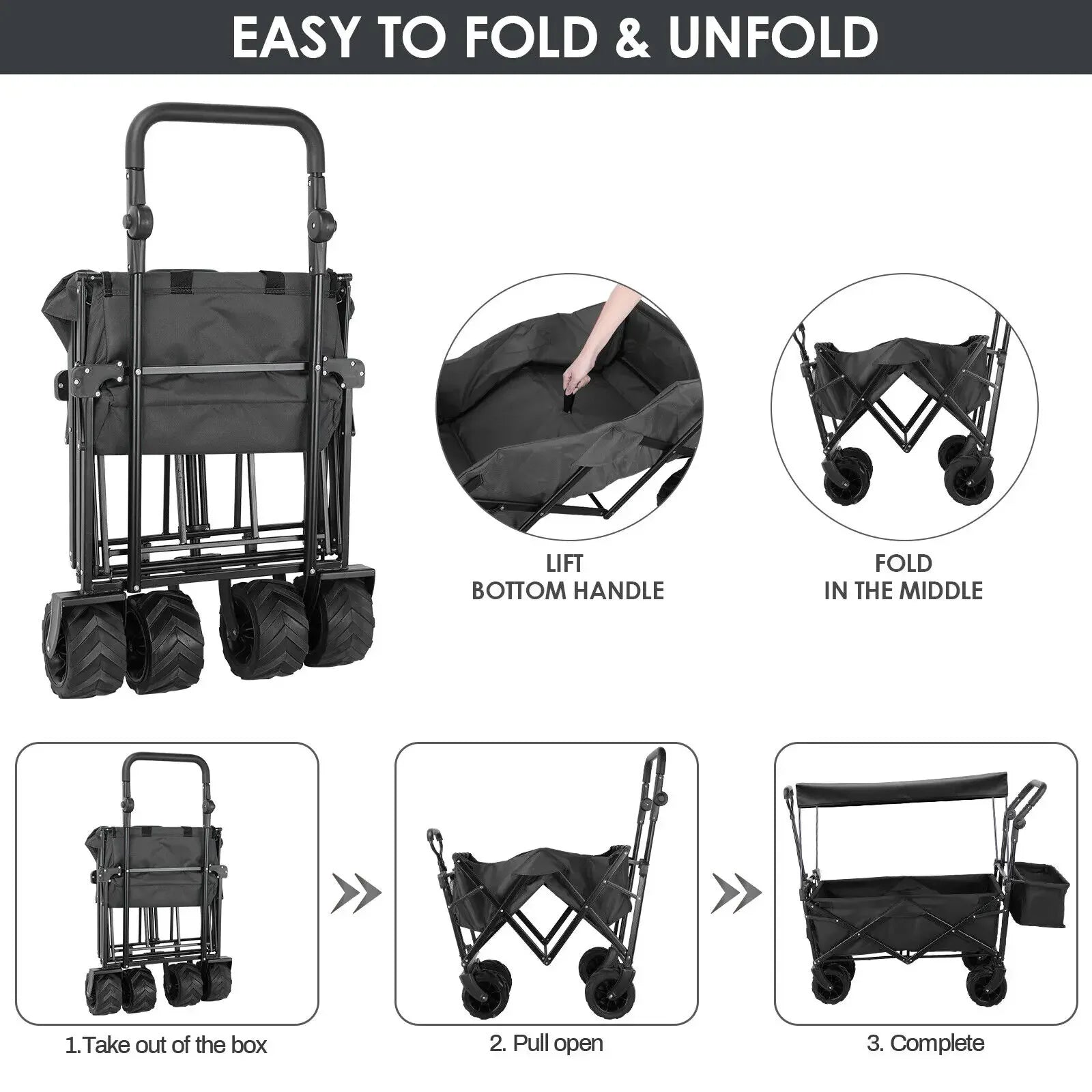 Ontworpen voor tuinieren, kamperen, picknicks, festivals of zwaar transport, vermindert deze kar de inspanning van het dragen van zware voorwerpen met de hand. De twee duw-/trekhandvatten met ergonomische grepen laten je je duw- of trekstijl aanpassen, terwijl de 7-inch wielen soepel rollen over gras, grind en bestrating. De extra opbergmand en gaaszakken houden kleine spullen georganiseerd en binnen handbereik.