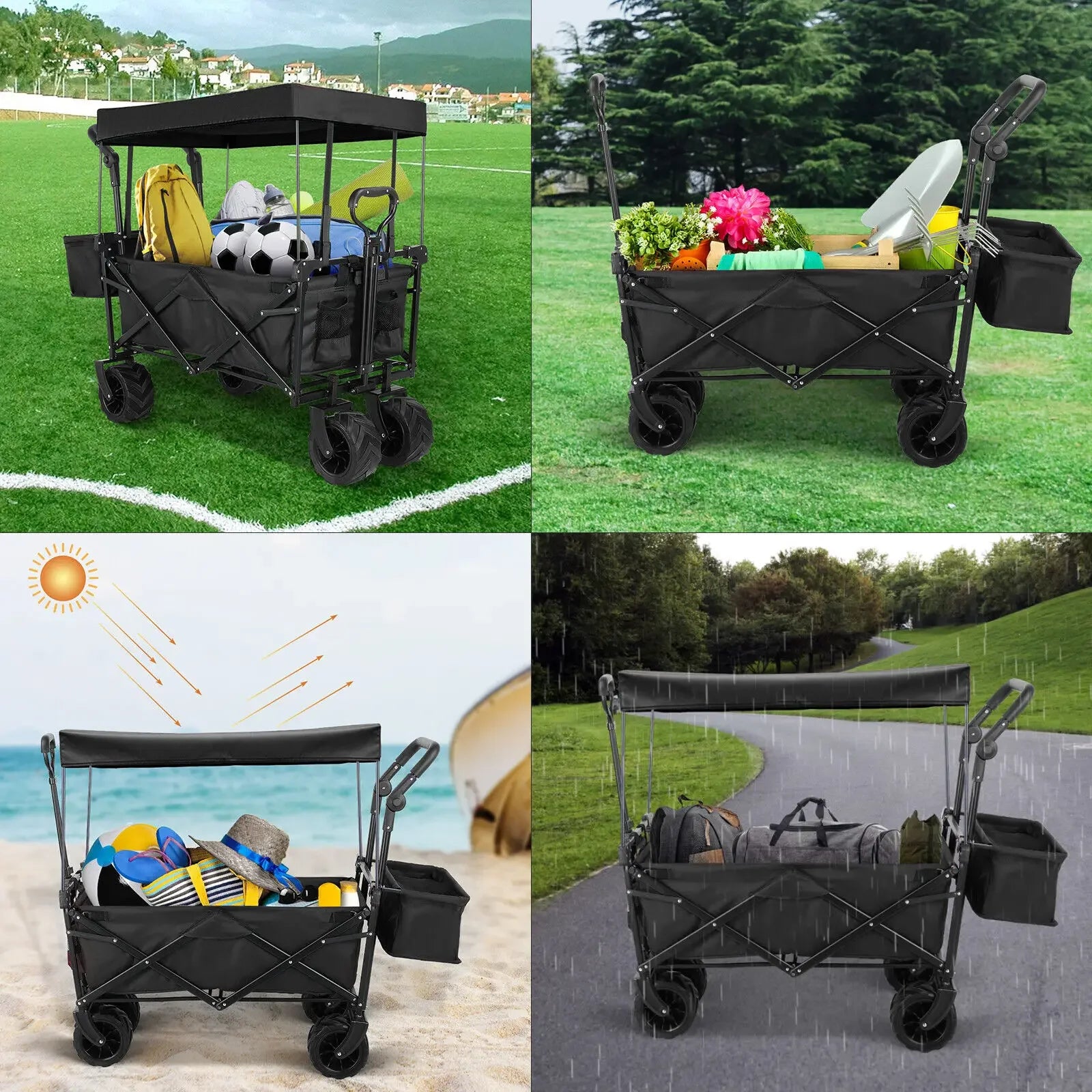 Maak kennis met de opvouwbare tuinkar met afneembare luifel — een robuuste, draagbare transportoplossing voor buitenklussen, boodschappen en gezinsuitjes. Gemaakt met een sterk stalen frame en versterkte lasnaden, ondersteunt deze kar tot 115 kg (250 lb) en combineert een duurzaam 600D Oxford stoffen laadruimte met een weerbestendige afneembare luifel. Wanneer schaduw of regenbescherming niet nodig is, is de luifel in een oogwenk los te maken, waardoor de kar een compacte, gemakkelijk op te bergen drager wordt. De grote capaciteit, all-terrain wielen en verstelbare handvatten maken laden, sturen en lossen eenvoudig en comfortabel.