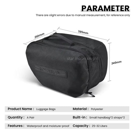 Ontworpen voor dagelijks gebruik en lange reizen, helpt de binnenzak je spullen te groeperen, voorkomt verschuiven in de bagage en maakt in- en uitpakken moeiteloos. Hij is lichtgewicht maar ruim, en biedt flexibele opslag voor gereedschap, regenkleding, snacks of elektronica—zonder het evenwicht van je motor of de integriteit van de bagage aan te tasten. Of je nu pendelt, toert of in het weekend op ontdekking gaat, deze tas ondersteunt je elke kilometer.