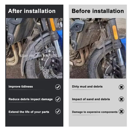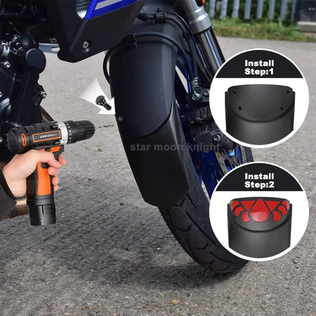 Upgrade uw Suzuki V-Strom 800RE (2024-2025) met deze Front Fender Extension Hugger van Star Moon Knight. Deze verlenging wordt bevestigd aan de OEM-voorspatbord om de bescherming te verlengen, waardoor vuil, modder en stenen worden weggehouden van uw uitlaat, lagere motor en radiator. Gemaakt van hoogwaardig ABS, levert het een duurzame, langdurige verlenging die de contouren van het spatbord volgt voor een naadloze, geïntegreerde uitstraling. Het wordt geleverd met plastic klinknagels en speciaal aangeschafte lijm pads voor mechanische installatie. Voor de meest veilige pasvorm wordt het boren van gaten en klinknagels aanbevolen. De verlengingslengte is 14,5 cm (5,7 in), wat zorgt voor verbeterde dekking zonder de vrije ruimte of handling te compromitteren.